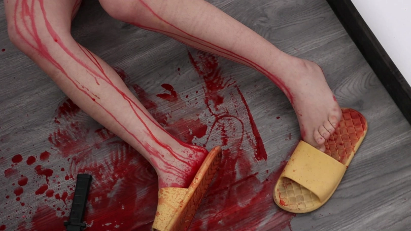 捅完后,歹徒松开捂嘴的手,歹徒将女主【已死亡】慢慢放在地上。过了一会儿歹徒处理女主的尸体将尸体拖进浴室。(拖行过程中鞋脱落)
