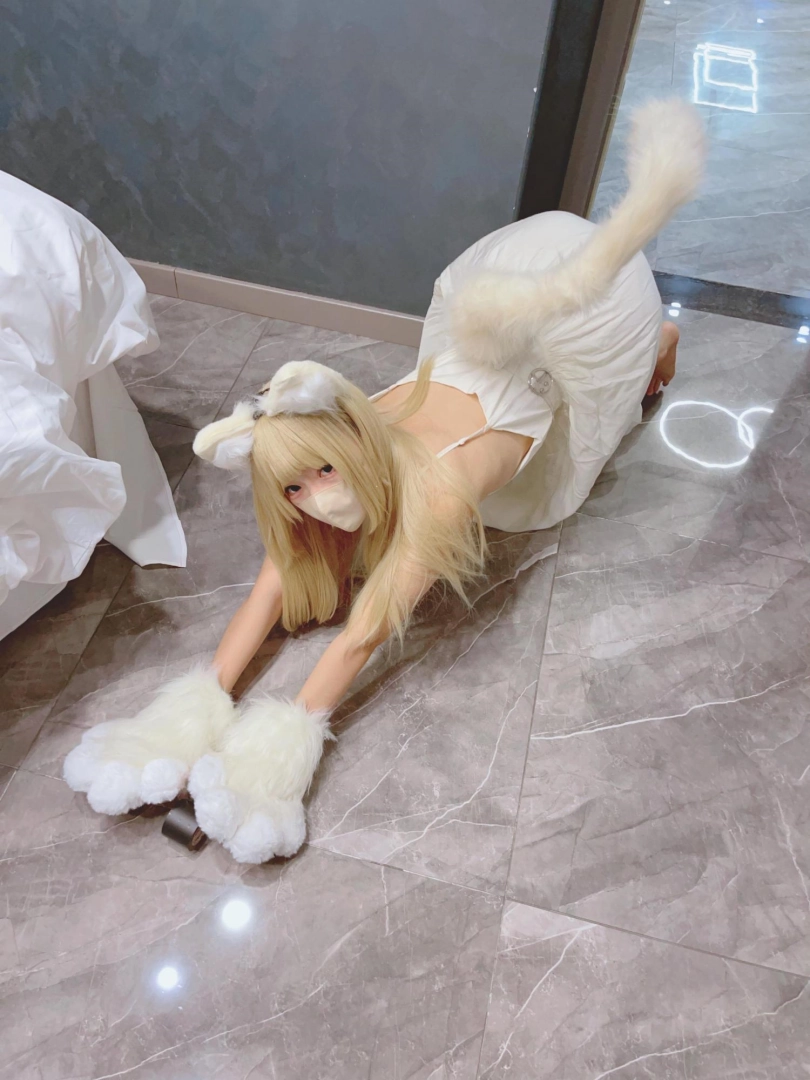 服装:黄豆粉cos服,蝴蝶结带铃铛,裸足+腿部绑带