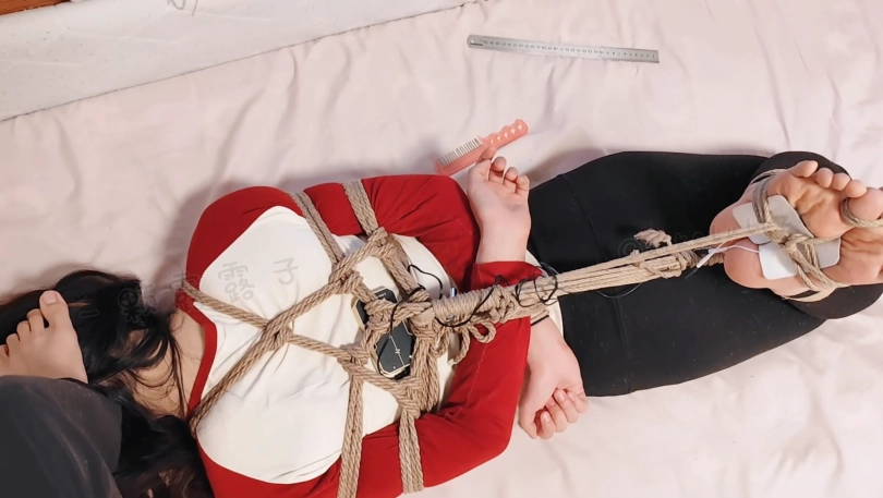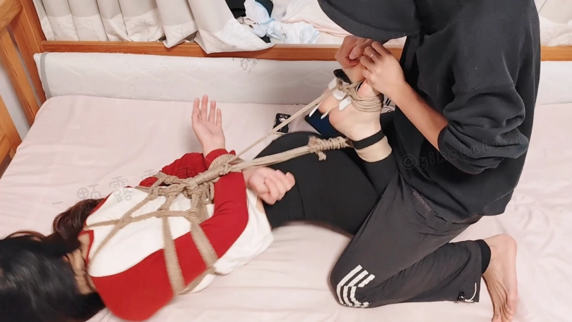 第三部分:给露露嫩嫩的脚心贴上郊狼贴片,上身日式紧缚,下身并腿捆绑,驷马攒蹄放在床上,脚趾和脚背被绳子牢牢固定,没有任何逃脱的可能性。郊狼贴片一直电击脚心,任何时间都有抽筋的可能,TK脚趾和脚心让露露挣扎不断,