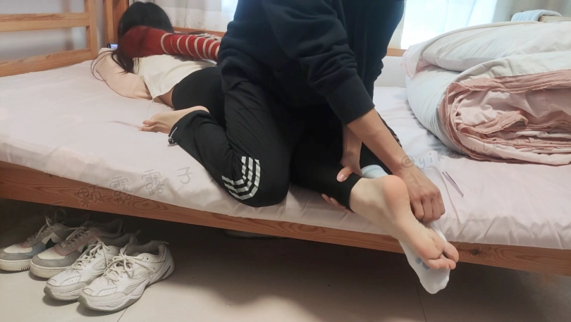 第一部分:直臂紧缚挠脚心内容是一只脚不穿袜子,一只脚穿白棉袜,用道具和手疯狂TK脚心和足部,双机位拍摄面部表情和脚部特写。道具为镊子和硬齿梳子,本就脚底怕痒超级敏感的露露,挣扎的幅度差点摁不住。