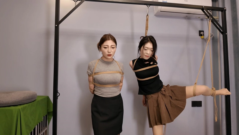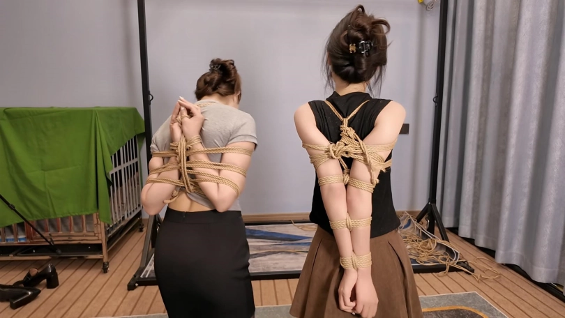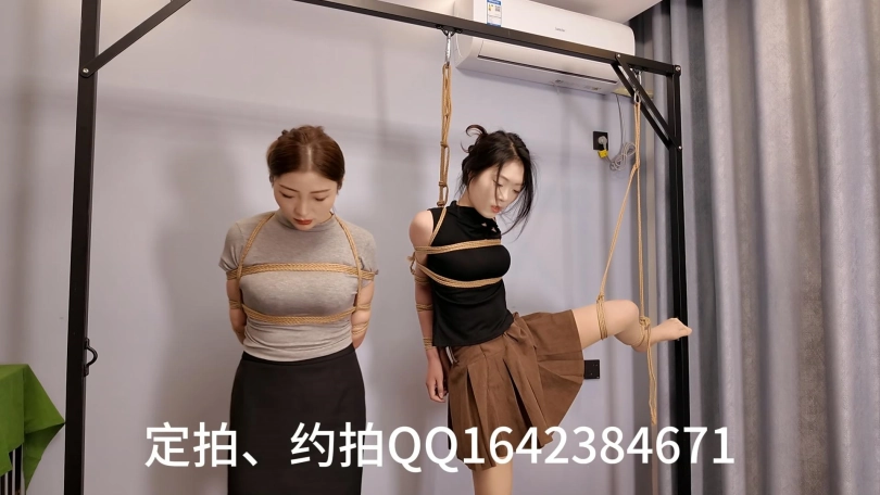 佳佳后手观音、小夏直臂、把两个美女紧紧的绑起来,鞭打,跪,调,最后采访捆绑的感受,她们觉得很舒服,很喜欢