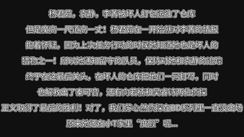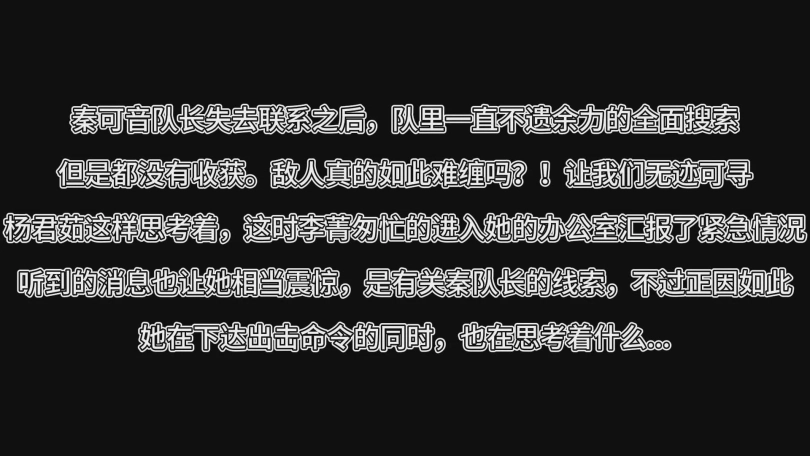 杨君茹队长接到了有关秦可音队长的线索,前往一探究竟,而等待她的将会是什么呢?