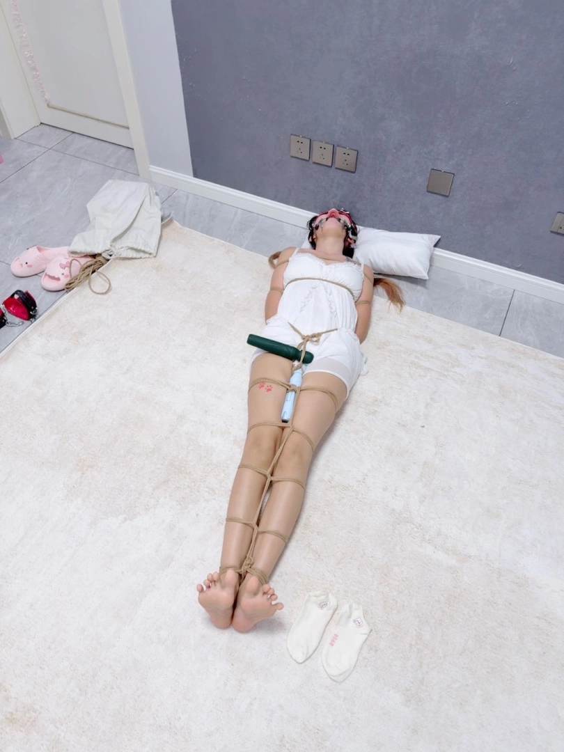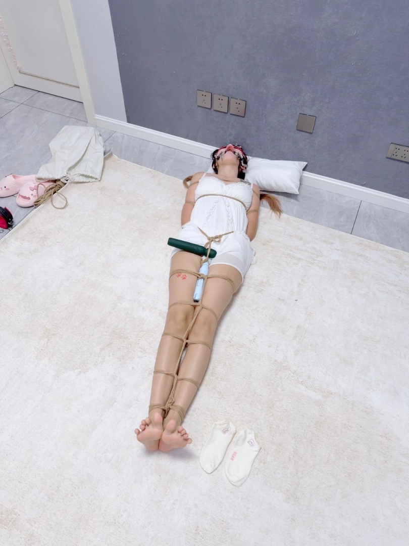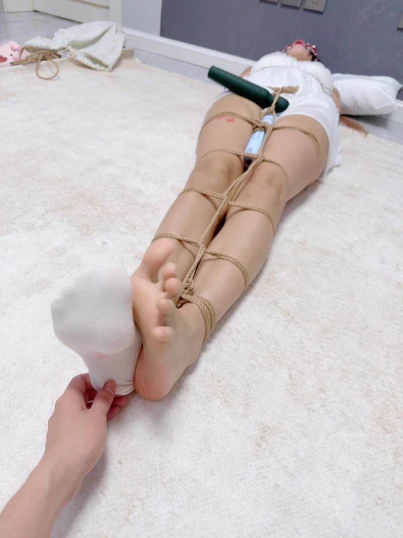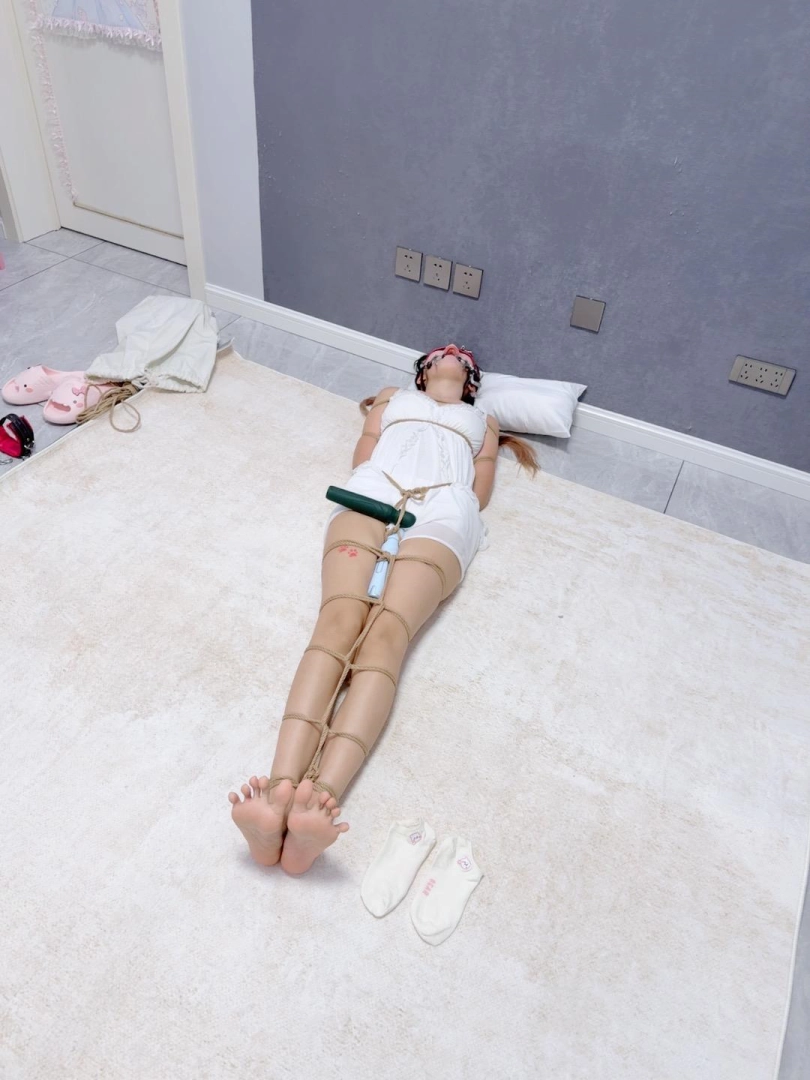 无需多言,上半身绑个经典日式,下半身做一个股绳,把新款电击极乐棒固定在绳裤上,然后双腿并腿拘束。