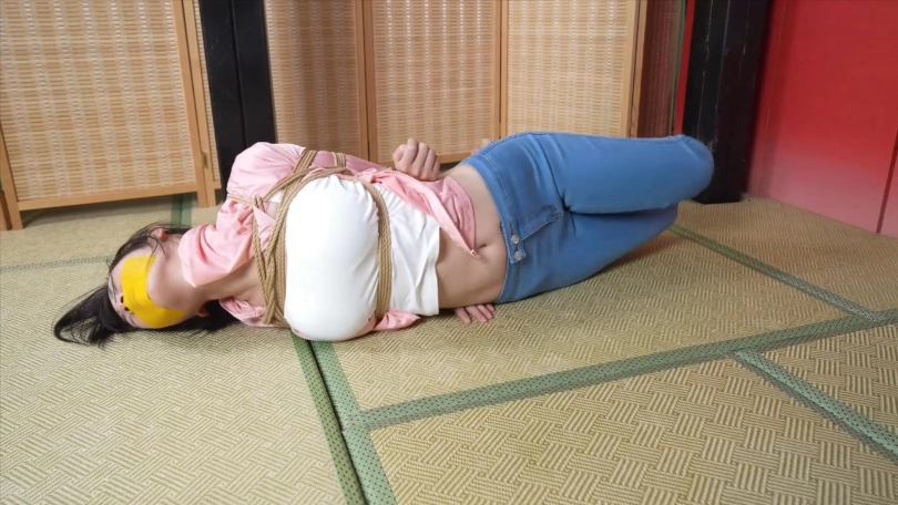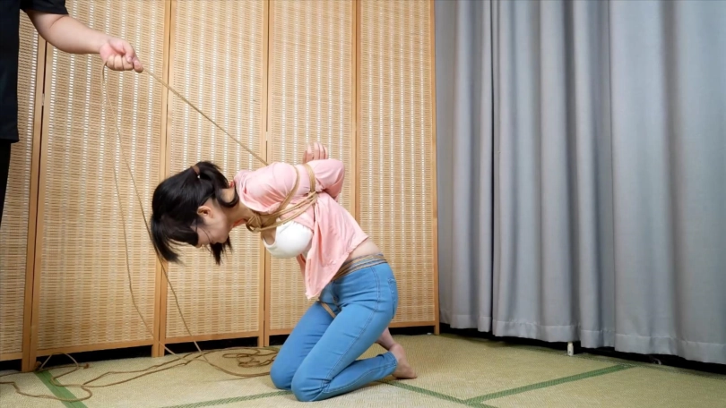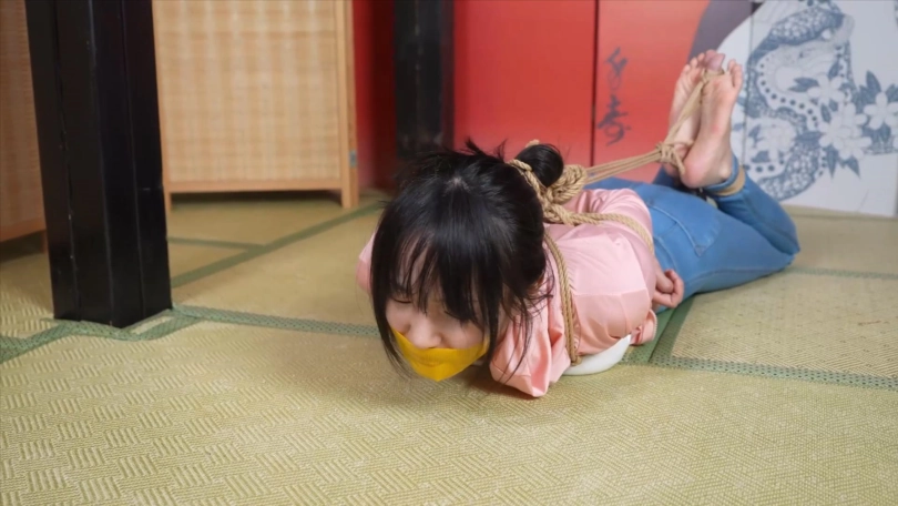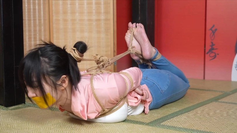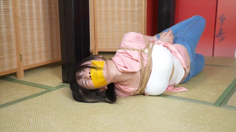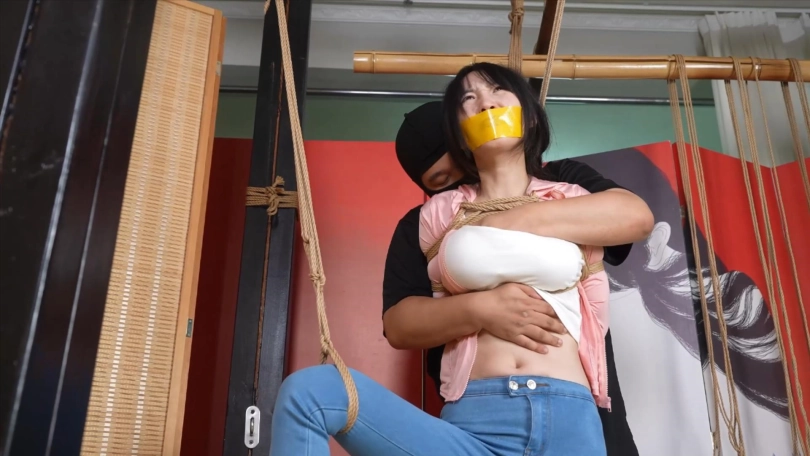 牛仔裤驷马胶带封嘴,单脚吊缚揉胸,布片塞嘴!