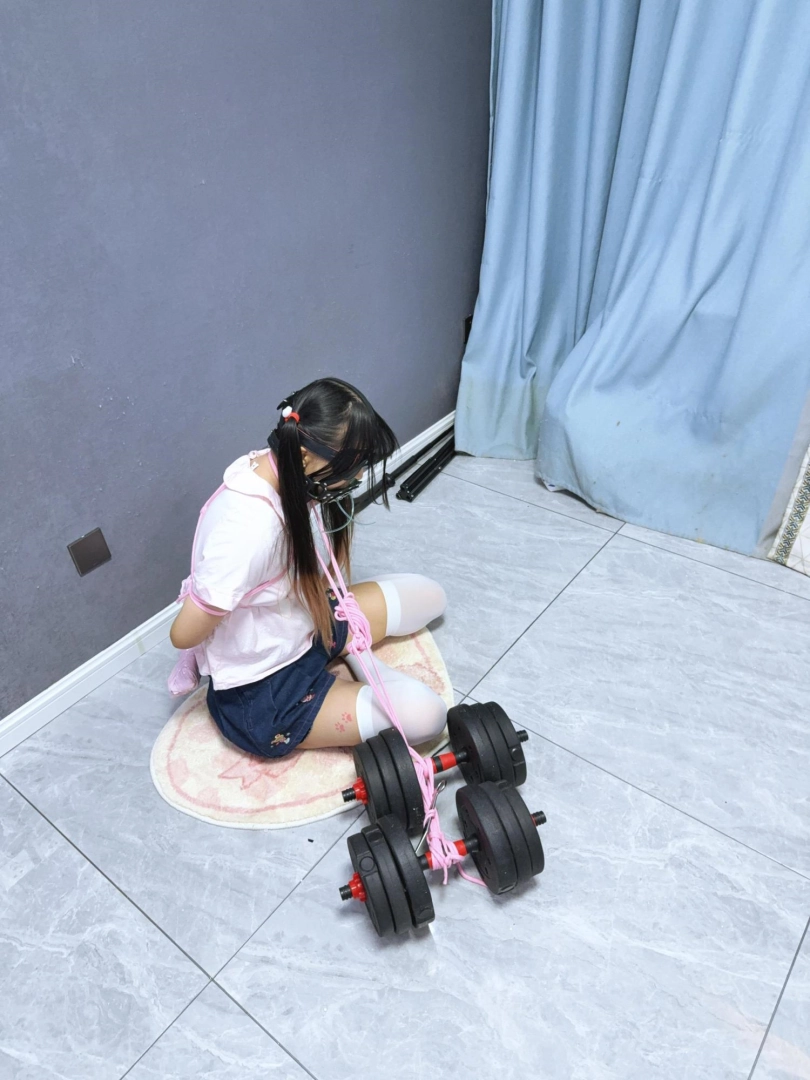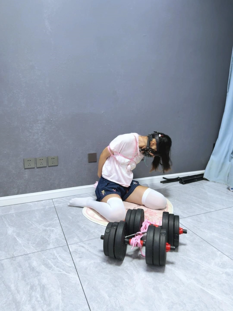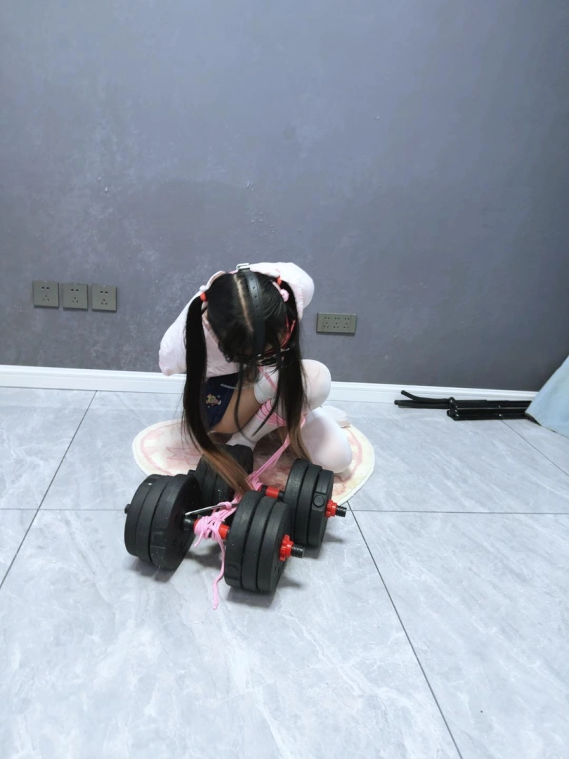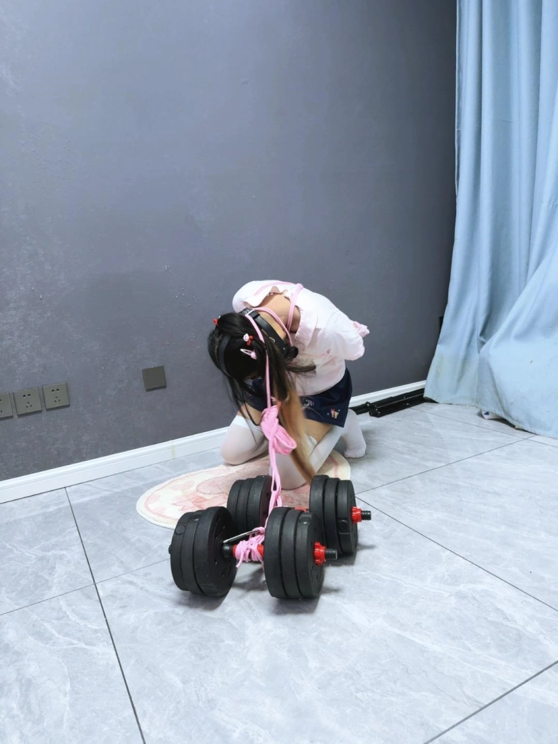 【全身拘束】:上半身用粉色棉绳绑日式,然后全身束缚成海老缚,盘腿拘束后,在脖子下方连接两个20kg共40kg的哑铃,并且把剪刀固定在哑铃上!