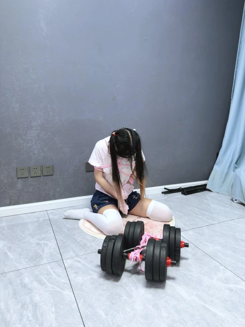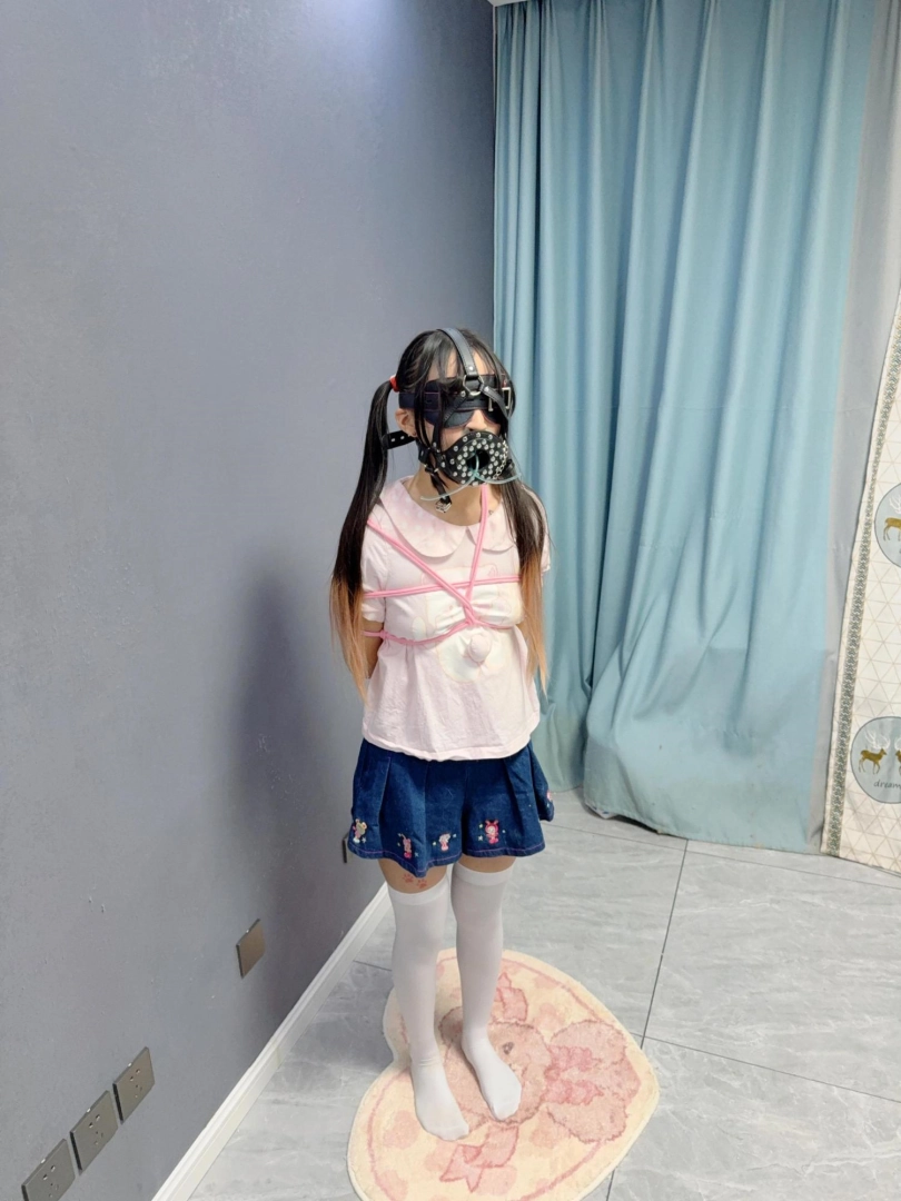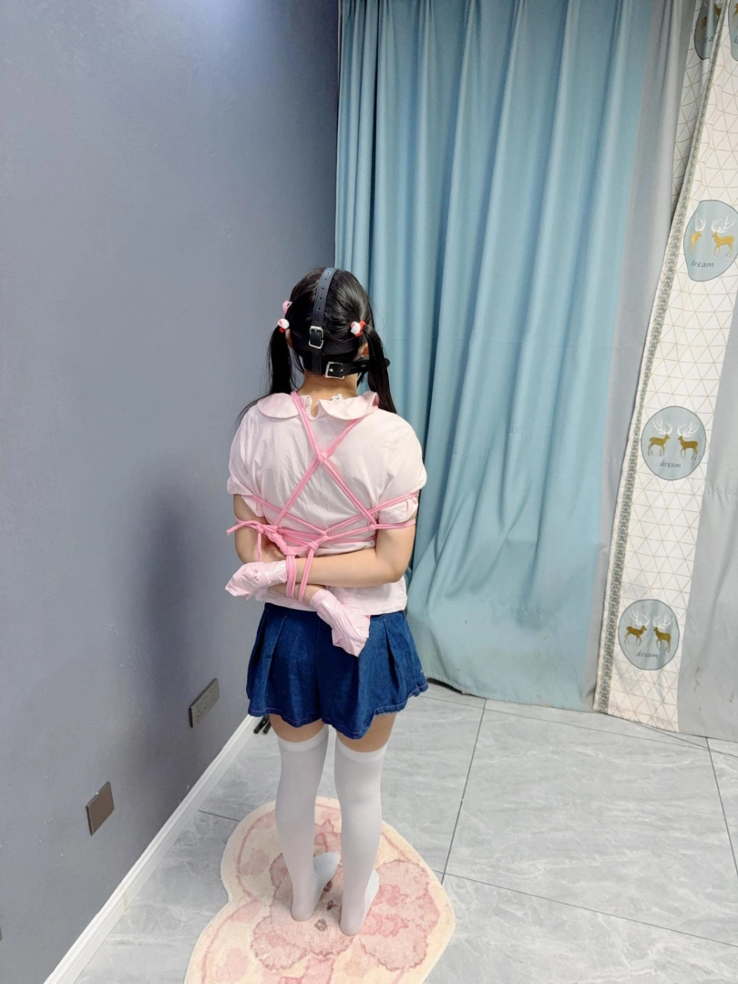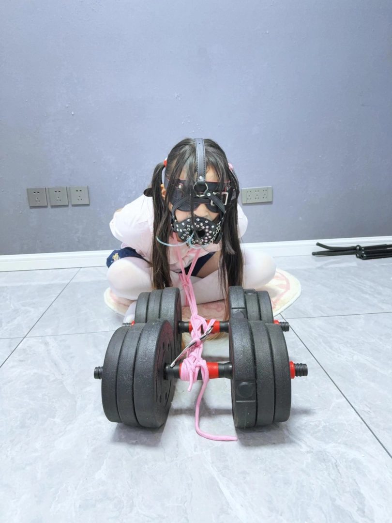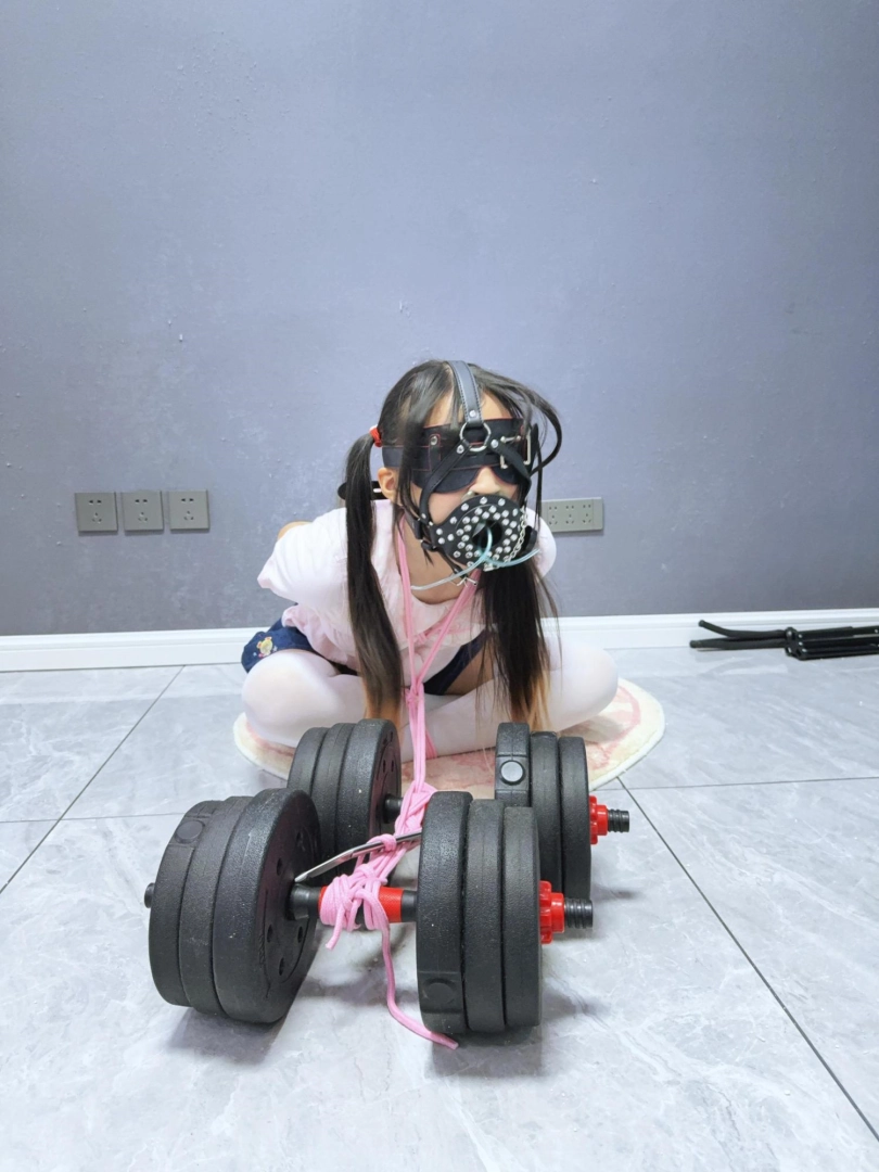【全身拘束】:上半身用粉色棉绳绑日式,然后全身束缚成海老缚,盘腿拘束后,在脖子下方连接两个20kg共40kg的哑铃,并且把剪刀固定在哑铃上!
