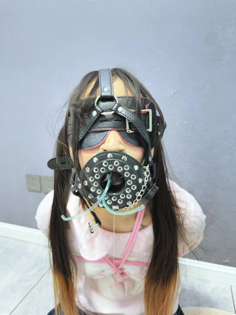 【头/面部拘束】:医用鼻管从鼻孔伸进去,从鼻腔穿过喉咙推到口腔伸出,然后从马具口枷伸出来。试过的都知道,鼻管的难受硬核程度是鼻钩的几十倍!放大声音可以听到妹子喉咙里因为鼻管刺激的咕噜声~