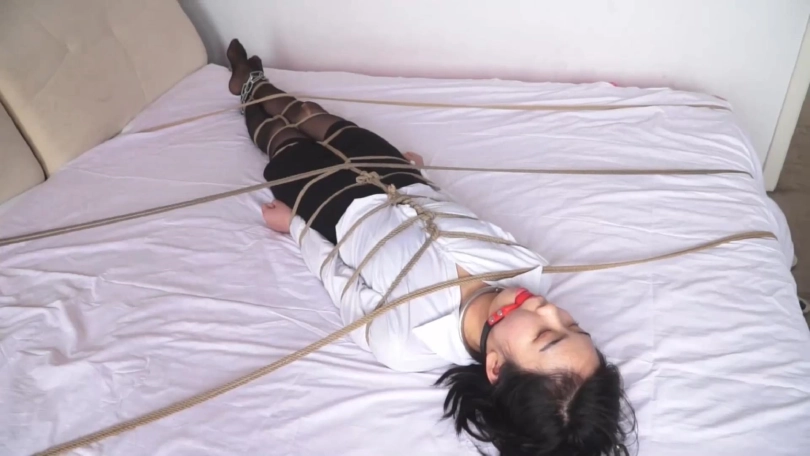 模特双臂被绑在身旁,双腿交叉被绑,口球封口。再用锁链捆绑,带上项圈限制在床上,动弹不得......