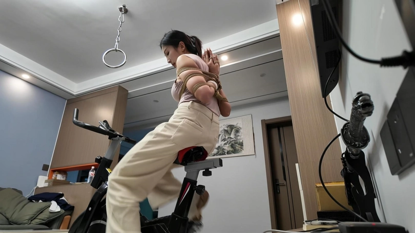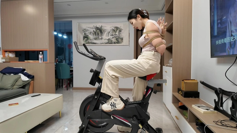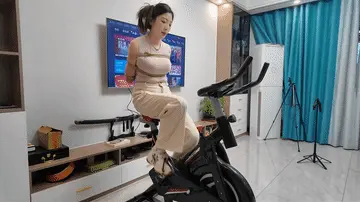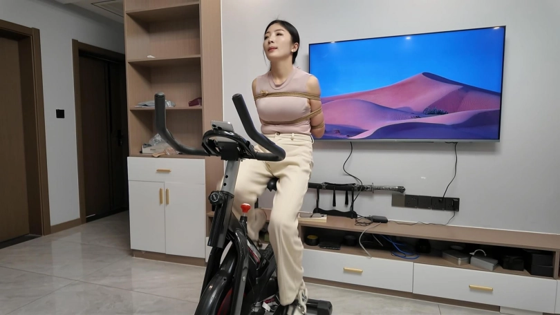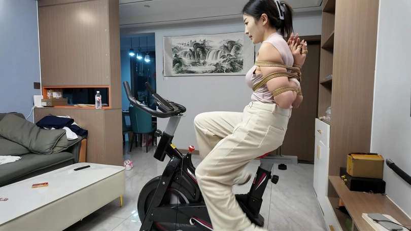 工作结束,佳佳看到工作室的动感单车,想着锻炼一下身体,不能放过这个机会,给她增加点难度,于是后手观音动感单车来了,随着音乐的响动,佳佳被紧紧的捆成后手观音,骑着动感单车.