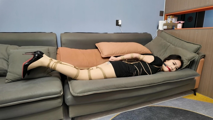 晓倩被龟甲捆绑,直臂驷马放置,十个脚趾也被紧紧捆绑,这个姿势太难受了,嘴也被口球堵着.