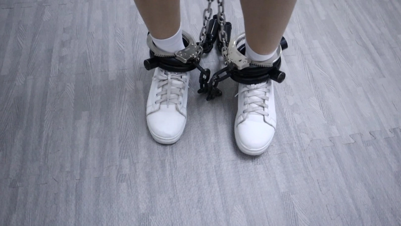 两副重脚镣+连体铐,可把妹子折磨得够呛,再吊铐起来,加上电击片刺激脚底,妹子腿都软了!!!岂有不招之理?