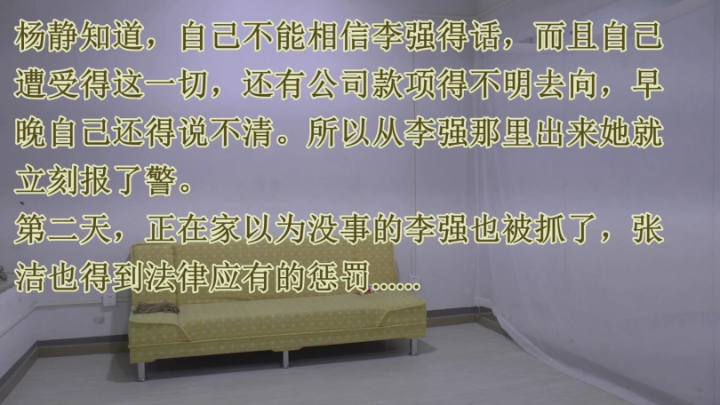 第二天,正在家以为没事的李强也被抓了,杨静知道,自己不能相信李强得话,而且自己遭受得这一切,还有公司款项得不明去向,早晚自己还得说不清。所以从李强那里出来她就立刻报了警。