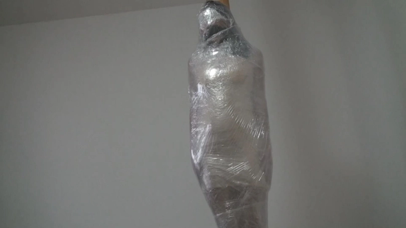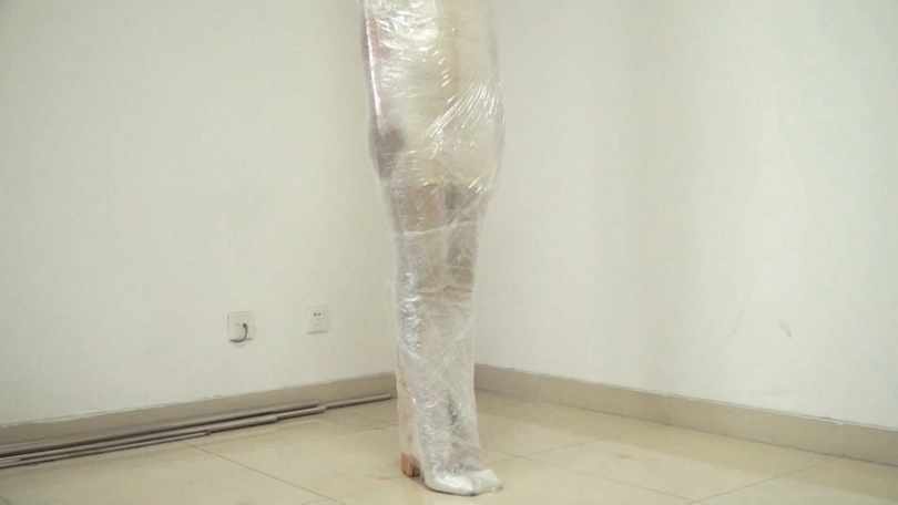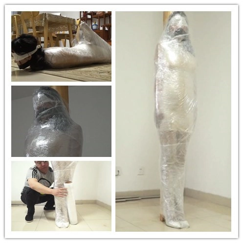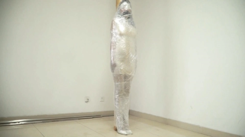 林丹丹被保鲜膜全包着,连身子都无法转动。