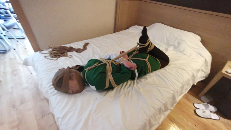 脱掉靴子趴在床上紧紧的捆绑成驷马,嘴里塞进丝袜,并用丝袜套住头蒙住眼睛。骗她有事出去下,小冷以为我真的出去了,房间就剩下被绑成粽子的自己,开始慌了,开始挣扎,并叨咕着什么(被堵着嘴,也不知道这丫头说的啥)。