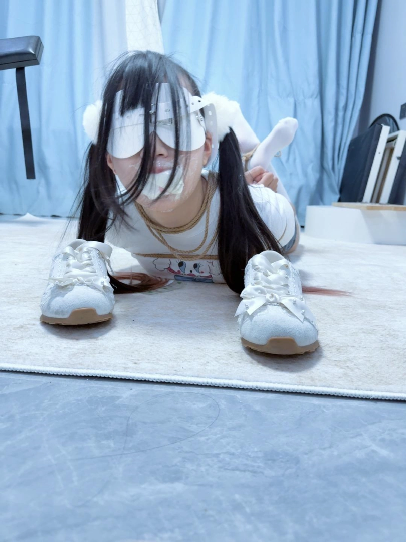 不同的是这次给妹子戴上了眼罩,并且把之前脱下的原味白袜塞进妹子小嘴里,堵嘴堵的结结实实、满满当当后用透明医用敷贴贴好。透明的医用敷料可以让大家清楚的看到堵满的小嘴~