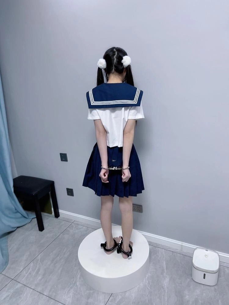 拘束完成后,开始对茶茶下达各种指令,比如罚站、罚跪、转身多角度展示、强制踮脚尖保持一定时间、带镣铐行走等。