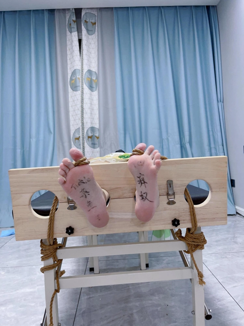 采访时只解开双手,脚底的按摩器会一直打开,茶茶需要在忍受足底挠痒的情况下回答问题~