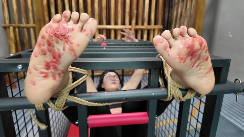 把小遥绑到笼子里面,脚控制外面绑好,滴蜡,用鞭子在把蜡烛抽掉,用皮鞭打,挠脚心,用板子打,用牙签扎,在反绑到凳子上继续皮鞭打屁股,最后用棒棒....最后拉回浴室给用刷子洗干净,下一部换着花样接着虐....