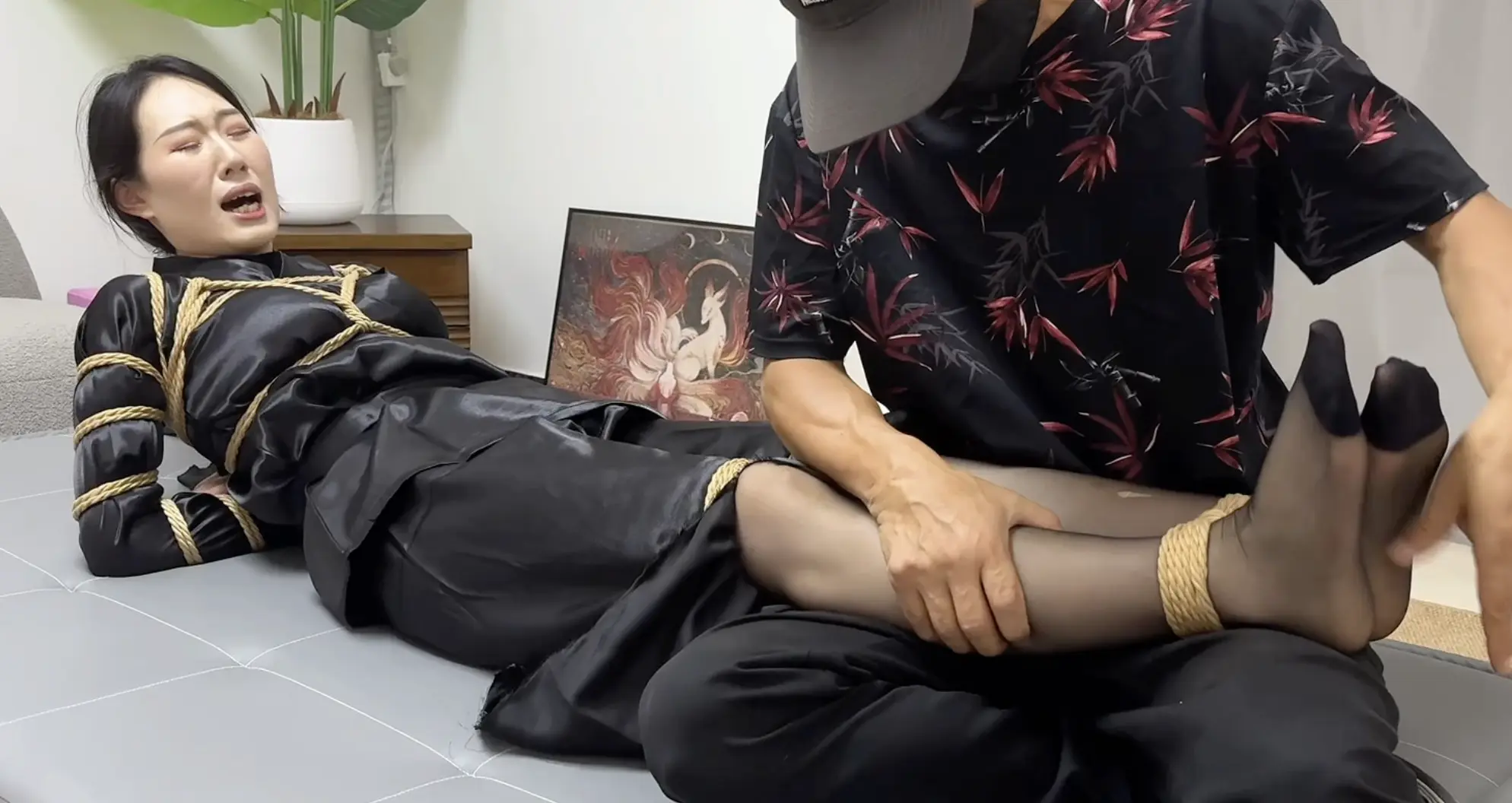 名模晓琪(琪琪、安然)演的女总裁大家都看了不少,有看过她穿上夜行衣饰演飒爽的女侠盗吗?头巾与面纱遮不住她发亮的冷白皮,宽松的黑衣裤(以及裤里黑丝)盖不住她曼妙的身段,而她精湛的武艺也当然也躲不过捕手的绳套陷阱和铁链麻绳,而刚烈侠女的不屈挣扎更刺激着他不安分的双手……不久后冬冬饰演的大姐拍马赶来,是英雄救美还是肉包子打狗——我倾向于后者,不过要等节后下集揭晓。