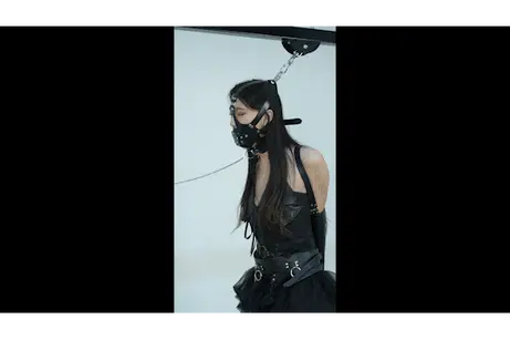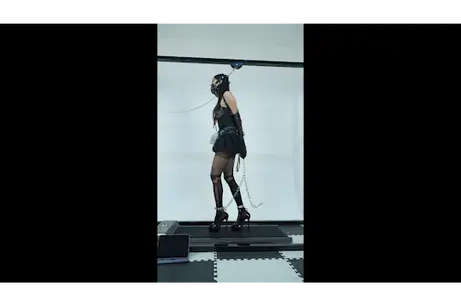 跑步机训练安排上,当然不会这么简单,头顶挂在吊环上,项圈连着前面限位,脚铐和单手套相连,小伪娘只能不停向前小步迈步,加上棒子震动刺激,没一会就香汗淋漓,坚持不住了。