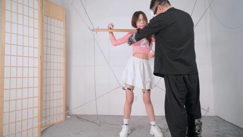 这个红色的足球宝贝的衣服本来是上衣加短裤,言妍自己搭配了一件学生气质的百褶裙,她这样一搭配,穿在她身上毫无违和感,加上白棉袜和加绒的运动鞋,这气质立马就出来了,把木枷吊起,腿上用了大腿铐,脚铐也用两根铁链限定了活动范围,言妍只能很小范围活动身体,这样放置简直太养眼了,经过TK、刺轮和电击器的攻击,她的呻吟声也激发出来了,对,就是我们喜欢的那个调调,又是声画俱美的片子!