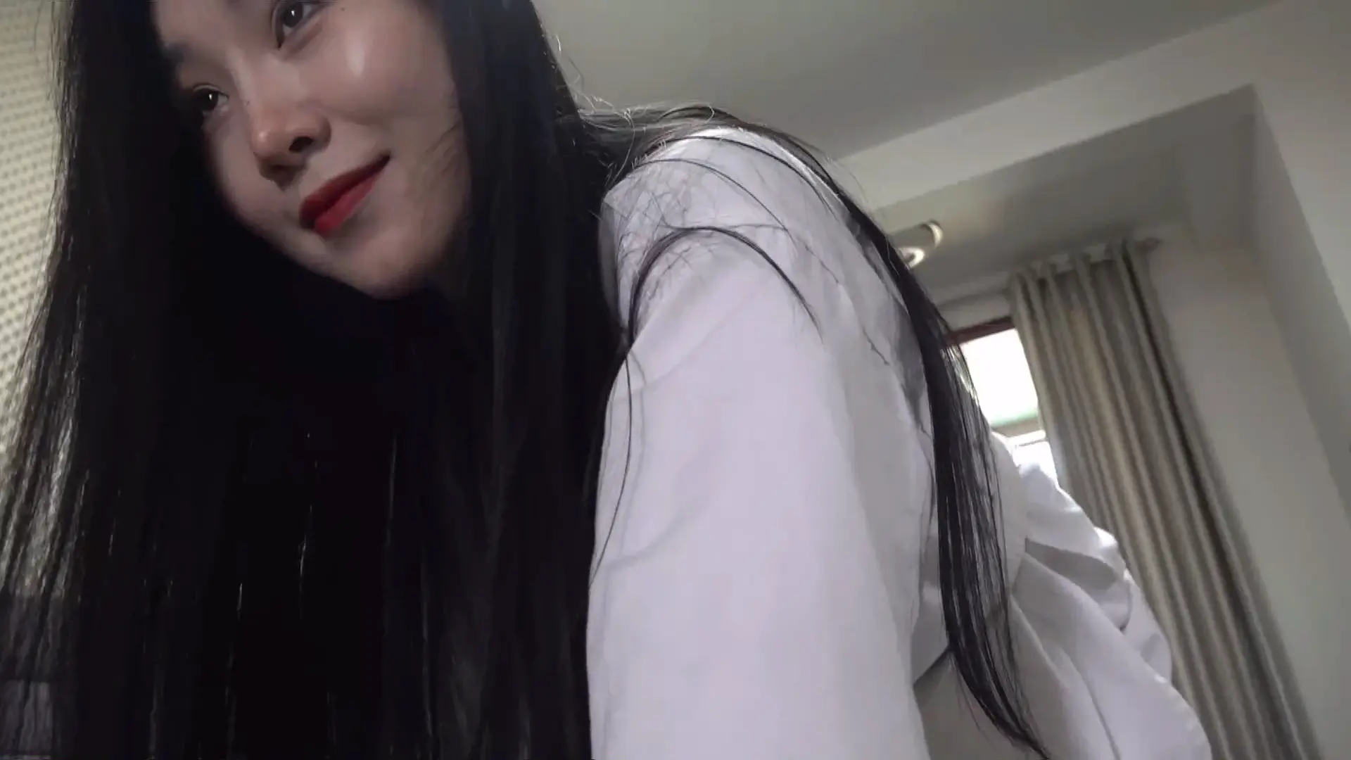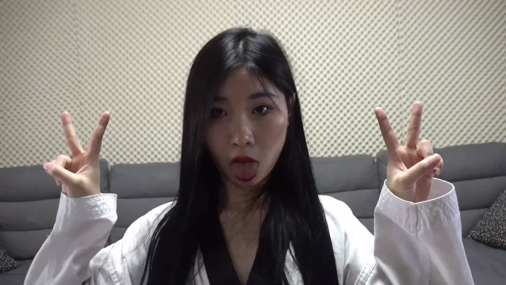 最后一幕,女主上身直立双腿跪在地上,两脚呈下图图示姿势,脚底露出来,两手比耶,面无表情,眼睛睁着,舌头吐出,像雕塑一样跪在屋子中间。镜头特写从女主脚开始向上一直到脸部(脚部和脸部停留时间可以稍长些,整个过程三分钟左右吧),最后给全身一个镜头然后逐渐拉远,结束。