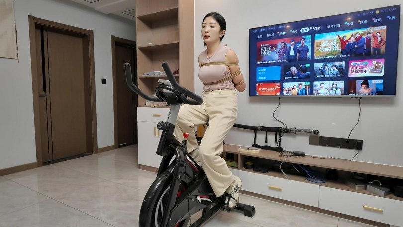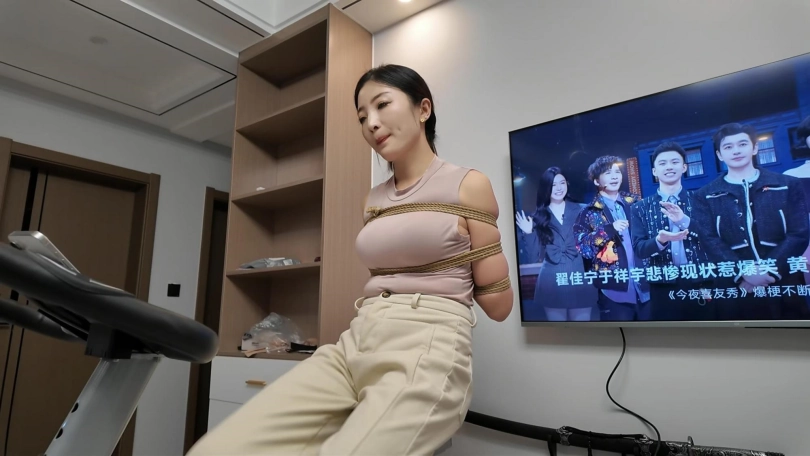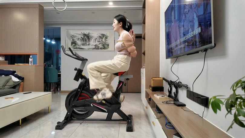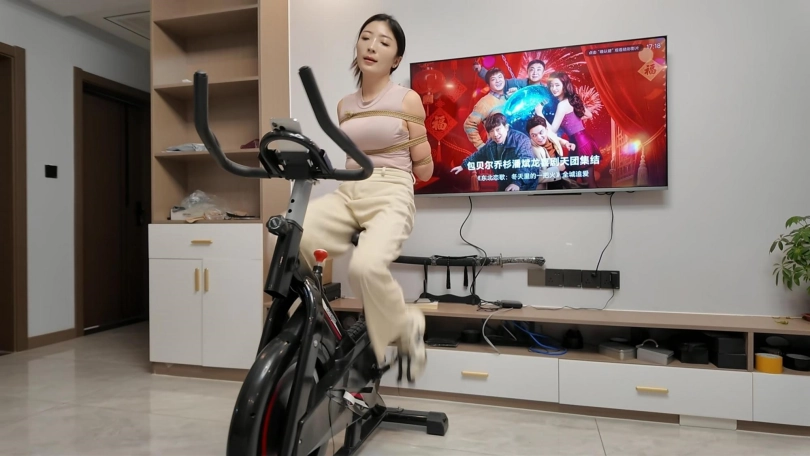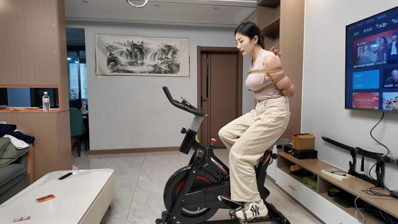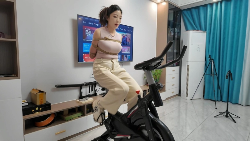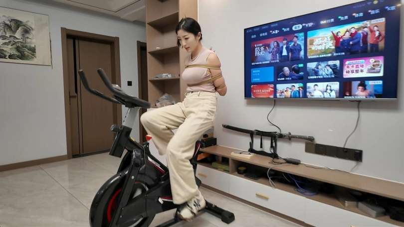 工作结束,佳佳看到工作室的动感单车,想着锻炼一下身体,不能放过这个机会,给她增加点难度,于是后手观音动感单车来了,随着音乐的响动,佳佳被紧紧的捆成后手观音,骑着动感单车.