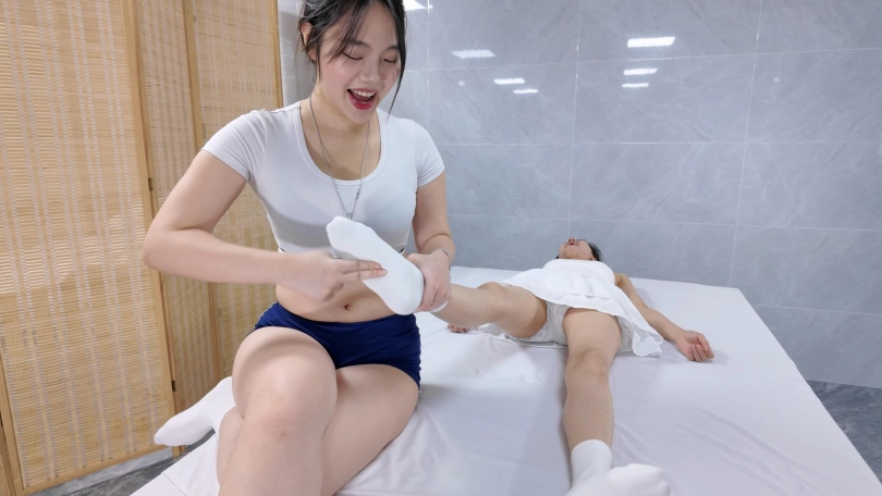 【时间煮雨美束】双女点穴定身加tk挠痒白袜,情节很丰富,女生颜值也很高,剧情包含定身穴、笑穴、被定住摆造型、挠脚心,情节多重反转