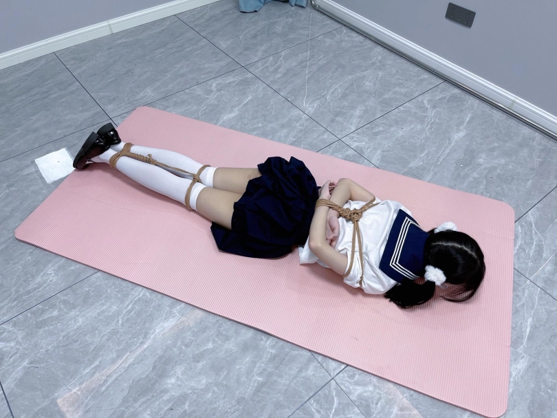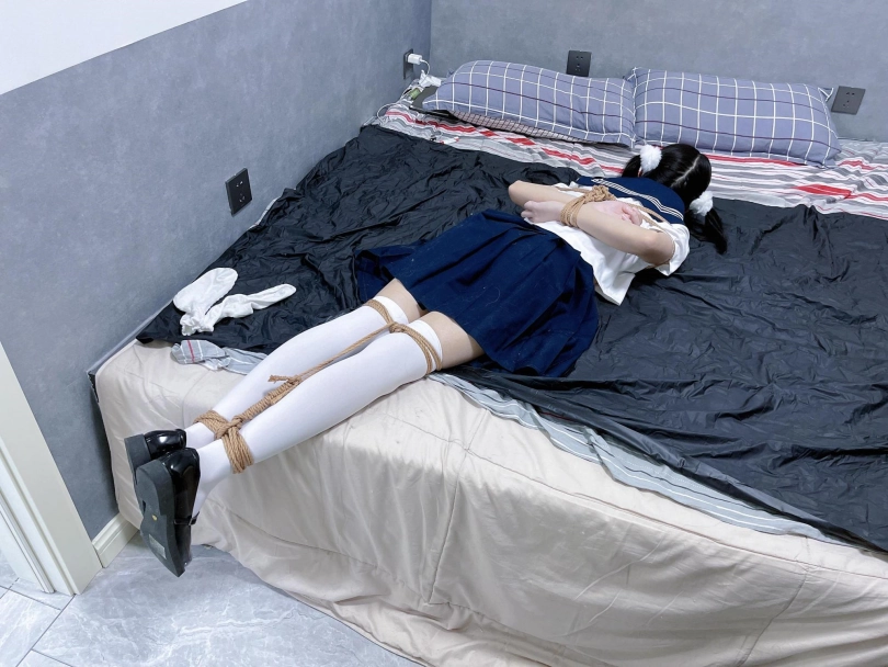茶茶出游回家后没有关好门,坐到床上后感觉有点困,衣服都没换便躺下睡觉了。 这时坏人悄悄溜进来准备窃取钱财,看床上躺着一个人,便以防后患将茶茶绑了起来(绑法:日式小高手,并拢绑住脚腕)。