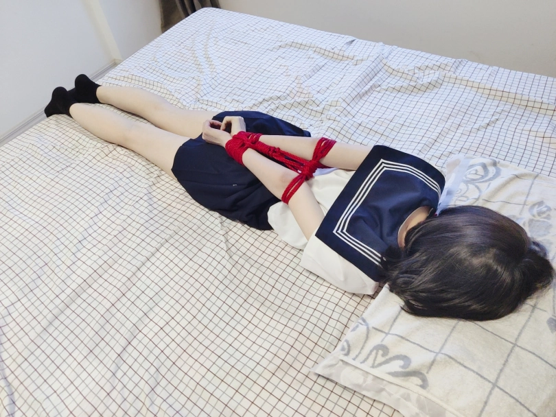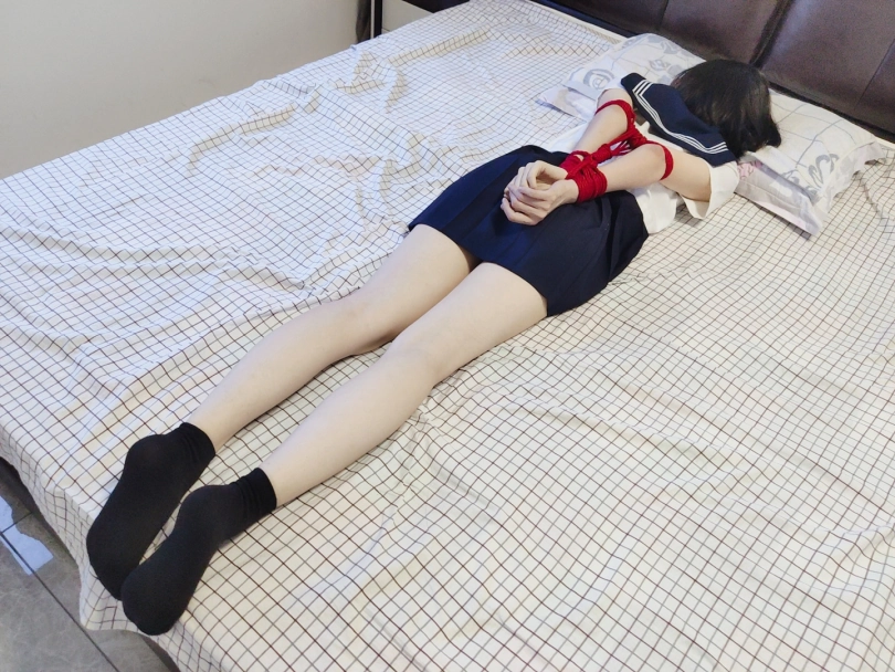 迷晕后将少女的双手严厉的直臂反绑,踢蹬的很欢实的黑色短袜小脚也并拢绑住。