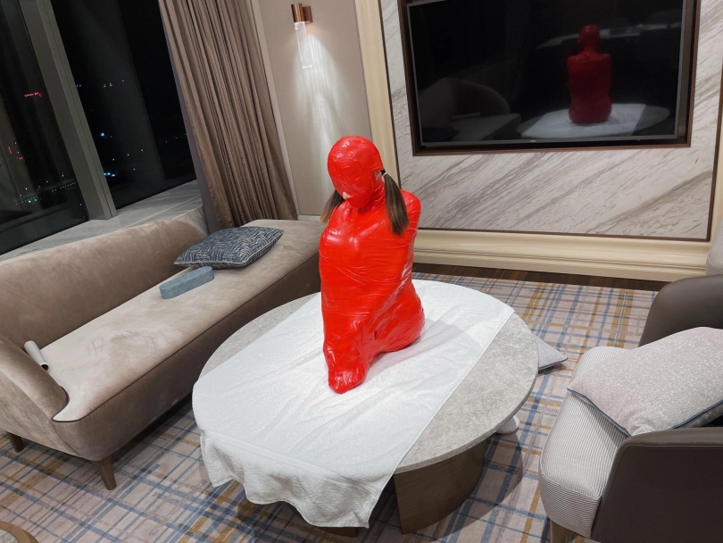 对方先是在茶茶的身体里塞入了玩具,随后茶茶娇小的身体被要求蜷缩起来,随后便被用一层保鲜膜和两层胶带仔细地全包贴好,随即就被摆放在客厅的大理石茶几上,作为一个人体摆件被放置着。