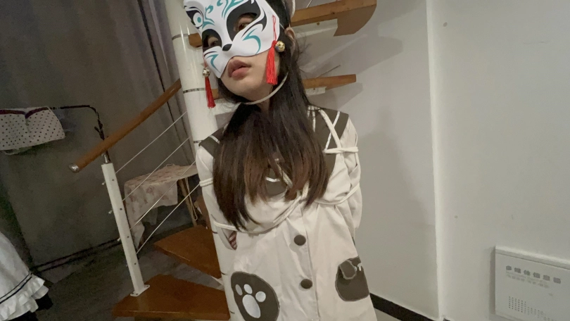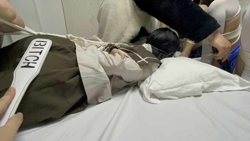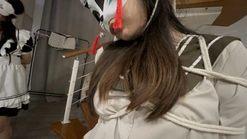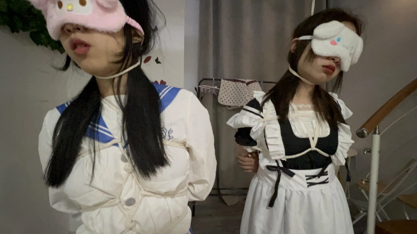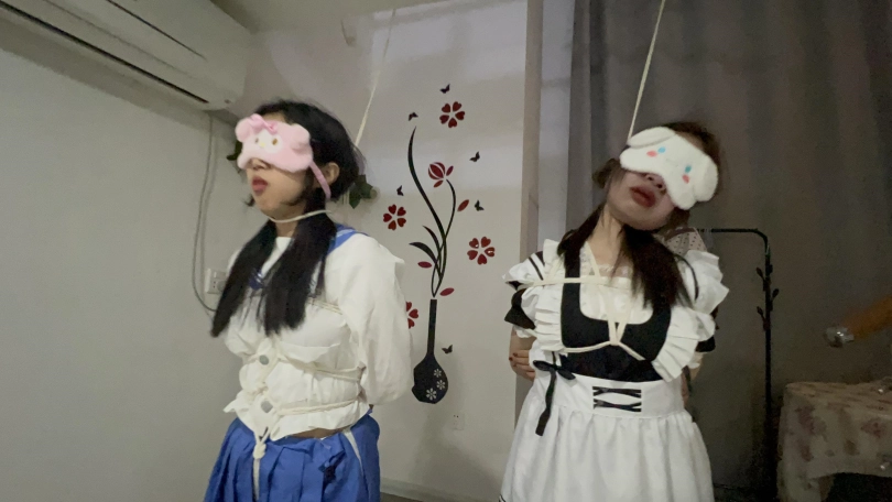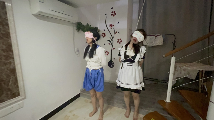 三位少女乐意接受绞刑处理,但毕竟年级还小还些不安,于是带上眼罩接受捆绑。