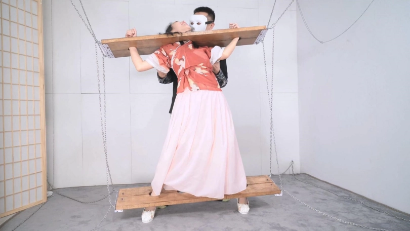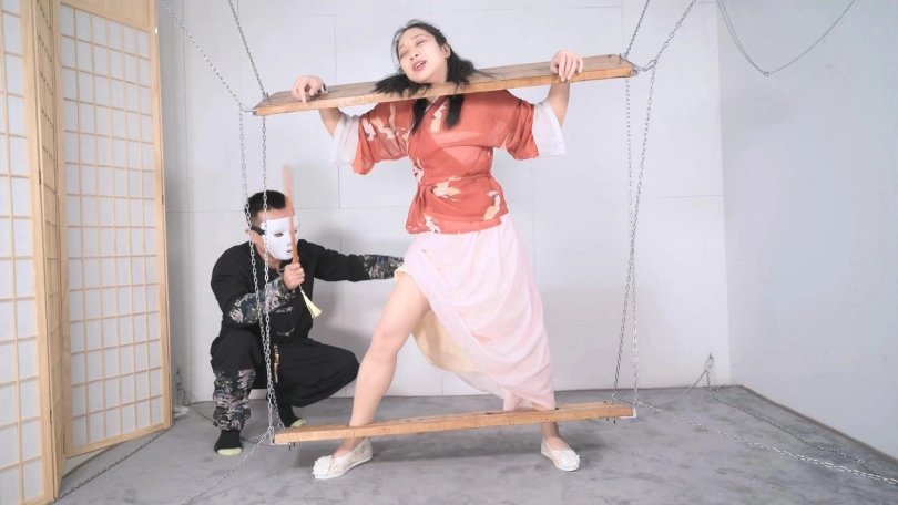 这套古装好似有魔力一般,沐小雨穿上就像戏精附体,表演欲爆棚,我这老演员都差点没接住,微剧情有点意思,不做过多介绍。单说这木枷组合,头一次用铁链连接吊起,固定作用明显,还有足够活动空间,据说古代犯人带着木枷时间过长,能够被活活卡死,我不太相信!于是顺着她的剧情,把沐小雨和木枷一起解下来,还真让她找到了求生姿势,就不知道如果戴着我这套厚重木枷能坚持多久了。