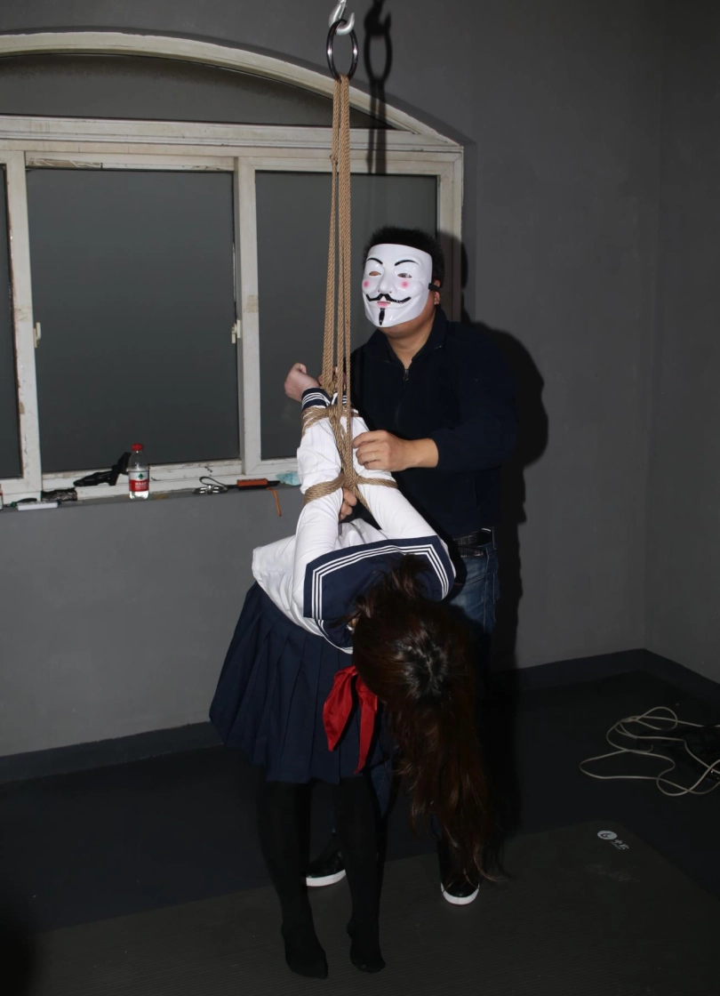 可怜少女仰面被放置,跳蛋无情刺激下体,更被拍打屁股。双手反吊,被迫翘起翘臀,蒙面怪客散鞭马鞭轮番飞舞,口水无法停止的滴落。最后更被吊起,双腿被强制分开,放入跳蛋。