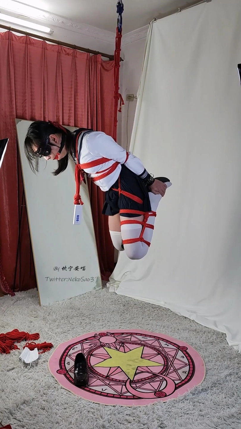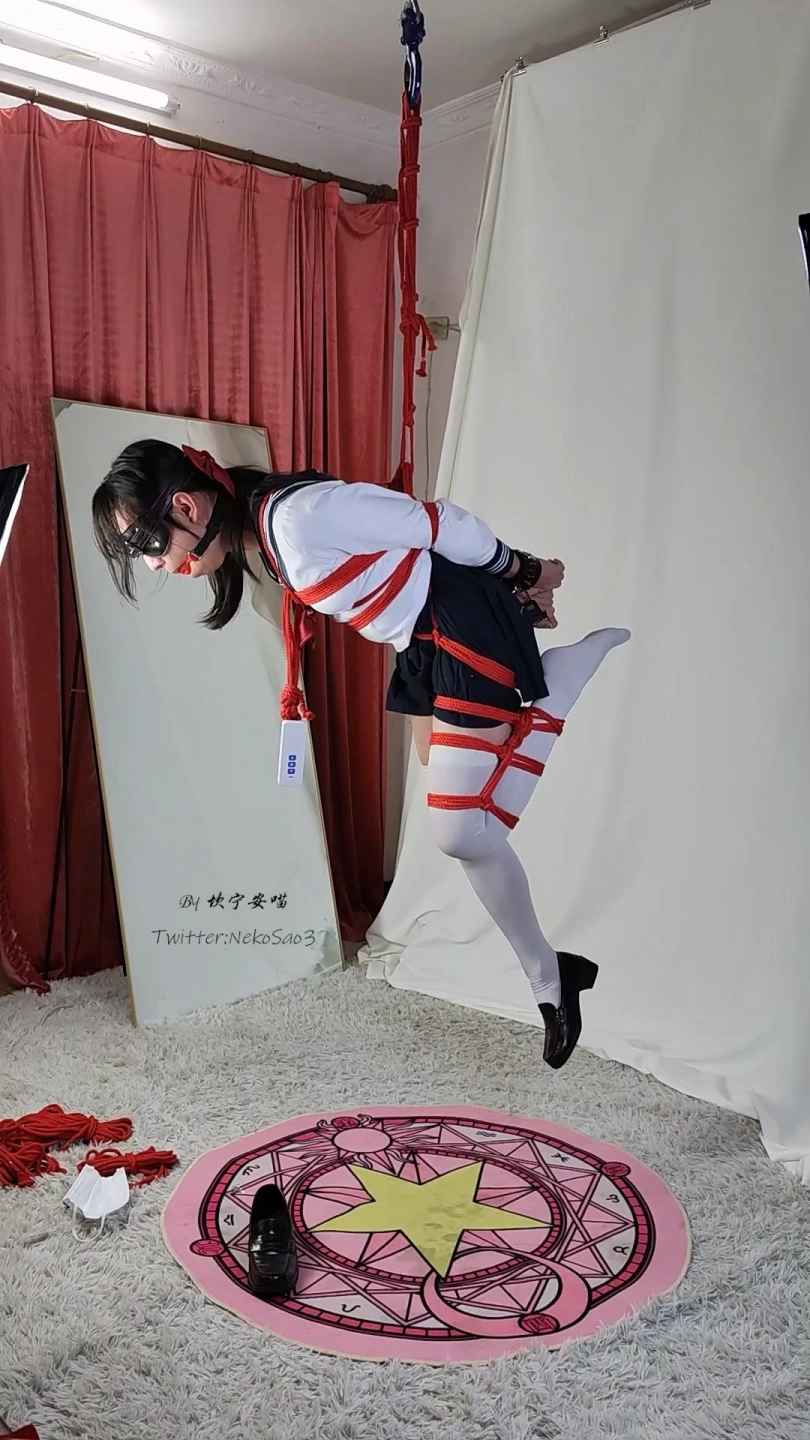 服装是水手服+过膝白丝,捆法是上身后手直臂+胯绳受力+一条腿折腿然后用电葫芦悬吊,道具还是经典的眼罩口枷训练器三件套~