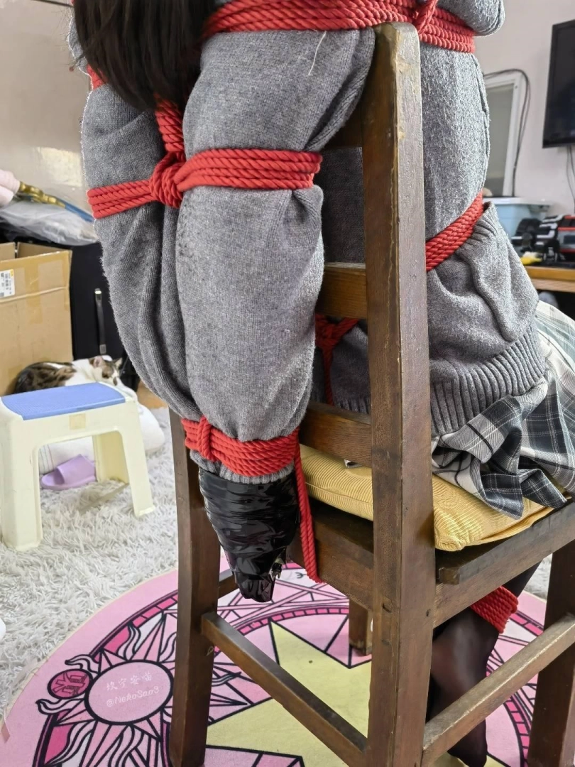 黑丝JK并腿直臂包手固定在椅子上,手脚相连放置