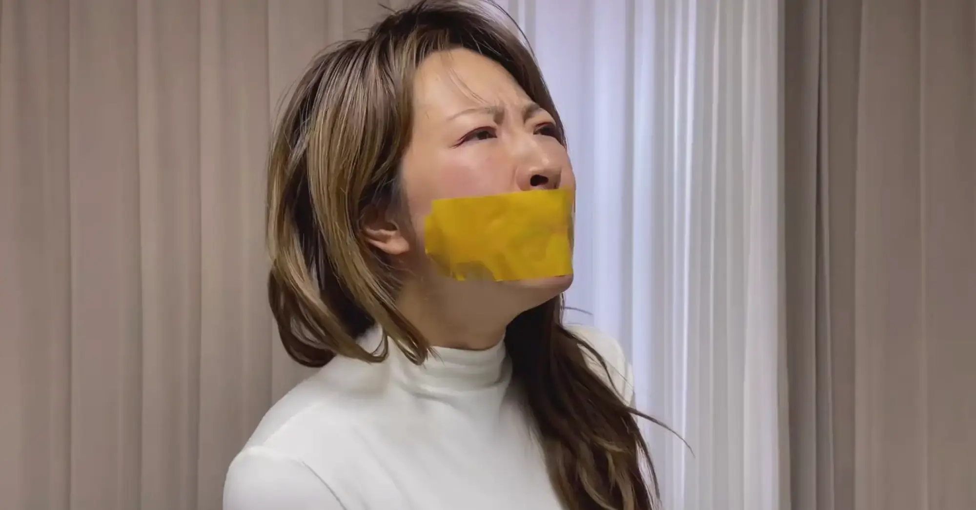 随后抬手对着镜头放松下来,抬手假装努力找到胶带连接口,(表演出)比较费力把胶带粘嘴那点撑开,让自己封着嘴巴可以正常说话。