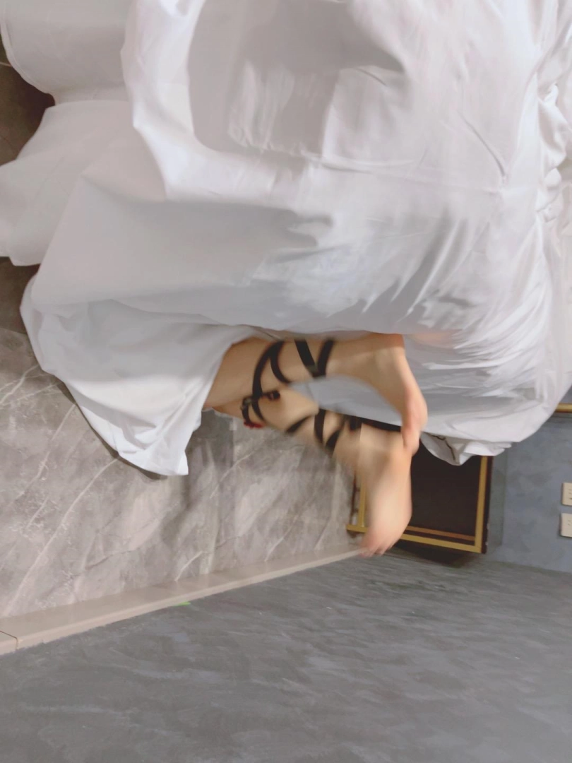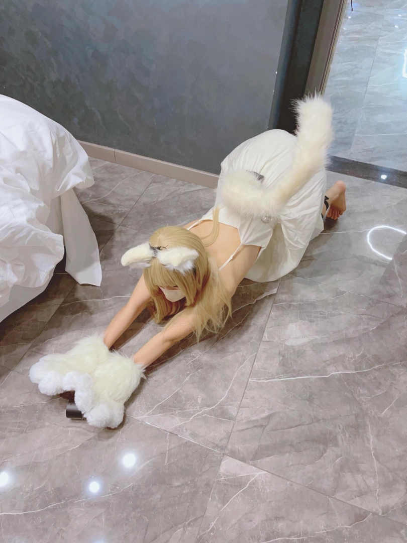 服装:黄豆粉cos服,蝴蝶结带铃铛,裸足+腿部绑带