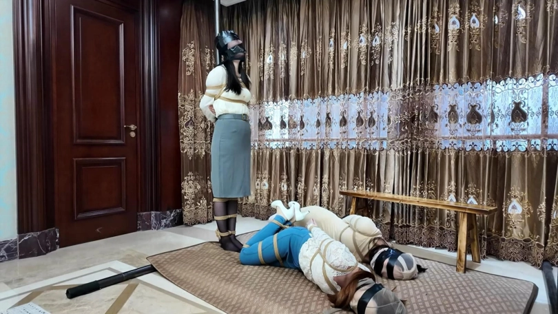 女老总在家中休息睡觉,醒来却发现自己的两个女保镖已经被捆绑封嘴制服,原来是仇家来报复她。所幸对方没有把事情做绝,只是将女老板威胁一番,也捆绑起来。女老总和她的保镖们不断地发出呻吟求救。两位保镖寸步难行,也没有挣扎的动力,只是无谓地发出呻吟声,扭动着身子。女老总奋力挣扎,脚上穿的高跟鞋都掉了下来。