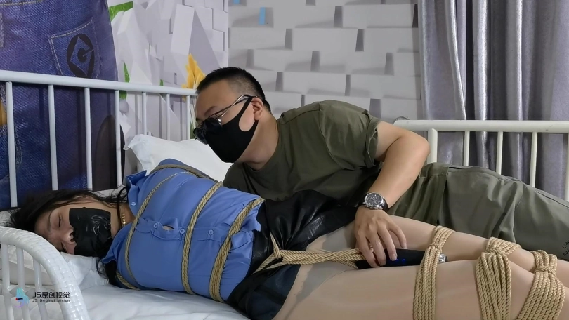女搜查官李然被哈妮递到后被绑着玩弄得全身软瘫后,哈妮穿回长靴正想离开房间,而李然继续被放置在床上,[X_X]继续震动。此时男同伴进入房间,问哈妮是否用魔绳递到了女搜查官。正当哈妮和男同伴对话后转过身时,男同伴突然拿出了一块手帕把哈妮弄晕,准备把哈妮也捆绑上一拼卖掉。男同伴把哈妮捆绑之前,他把李然的[X_X]弄了出来,然后换上了一支[X_X]绑在李然的双腿之间后打开,然后向李然表示在这个状态下看好戏。李然可惨了,刚不久前才承受完TD的折磨,连气还没回复过来更要接受接下来棒棒的刺激,再这样下去,她可根本受不了不断的GC。男同伴任由李然在床上忍受刺激,他先把哈妮的双手各自握成拳头,然后各自套上三只肉色短丝袜,用黑色静电胶带把各自的拳头完全缠绕,之后套上两只白色中筒棉袜。魔绳此时溜过去哈妮的身边,把她的全身捆绑成和李然相同的。哈妮此时醒了过来,问男同伴究竟要干什么,男同伴表示也要把哈妮一同卖掉。哈妮一直咒骂着男同伴,但男同伴没有理会,他更表示要把哈妮捆绑我更加严厉些,之后用胶带把哈妮的上胸、下胸、腰部、大腿、膝盖上下和脚踝进行拘束,床上的李然棒棒的折磨下观看着过程继续挣扎强忍GC。男同伴把哈妮拉过去床边的一条柱子,然后用拘束皮带把哈妮的全身固定在处子上。他拿来了一条肉色连裤袜,把整条连裤袜慢慢地塞进哈妮的嘴巴,用黑色的大胶布把哈妮的嘴巴、面颊和下巴封了起来。男同伴愈堵愈兴奋,他更脱下了自己的一只臭棉袜按在哈利的鼻子和嘴巴上,用一卷白色的绷带进行缠绕,最后戴上了一只大白色棉口罩盖过整个鼻子和嘴巴,使哈妮几乎发不出声音。男同伴准备了另一支[X_X],从哈妮的黑色连裤袜的袜腰[X_X]打开,之后不断抚摸哈妮的丝袜脚和胸部,哈妮认不住发出弱小的呻吟声,身体在棒棒的刺激下很快便忍不住颤抖起来,却在严厉的捆绑下完全反抗不了,原来男同伴他一早已对哈妮起了色心。男同伴不忘床上的李然,忍不住把她卖出前玩弄过爽,没有放过李然的意思,那怕她已经疲惫不堪的。 在旁站着的哈妮在五官被剥夺和四肢不能动的情况下,也全力接受着棒棒的折磨。