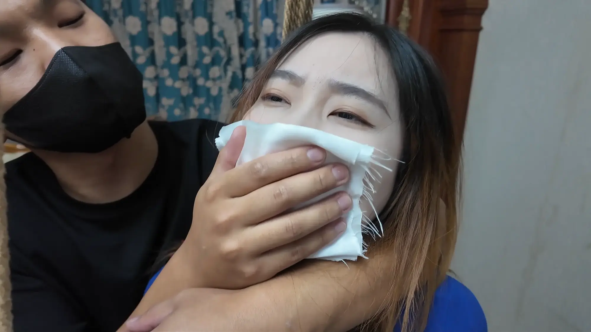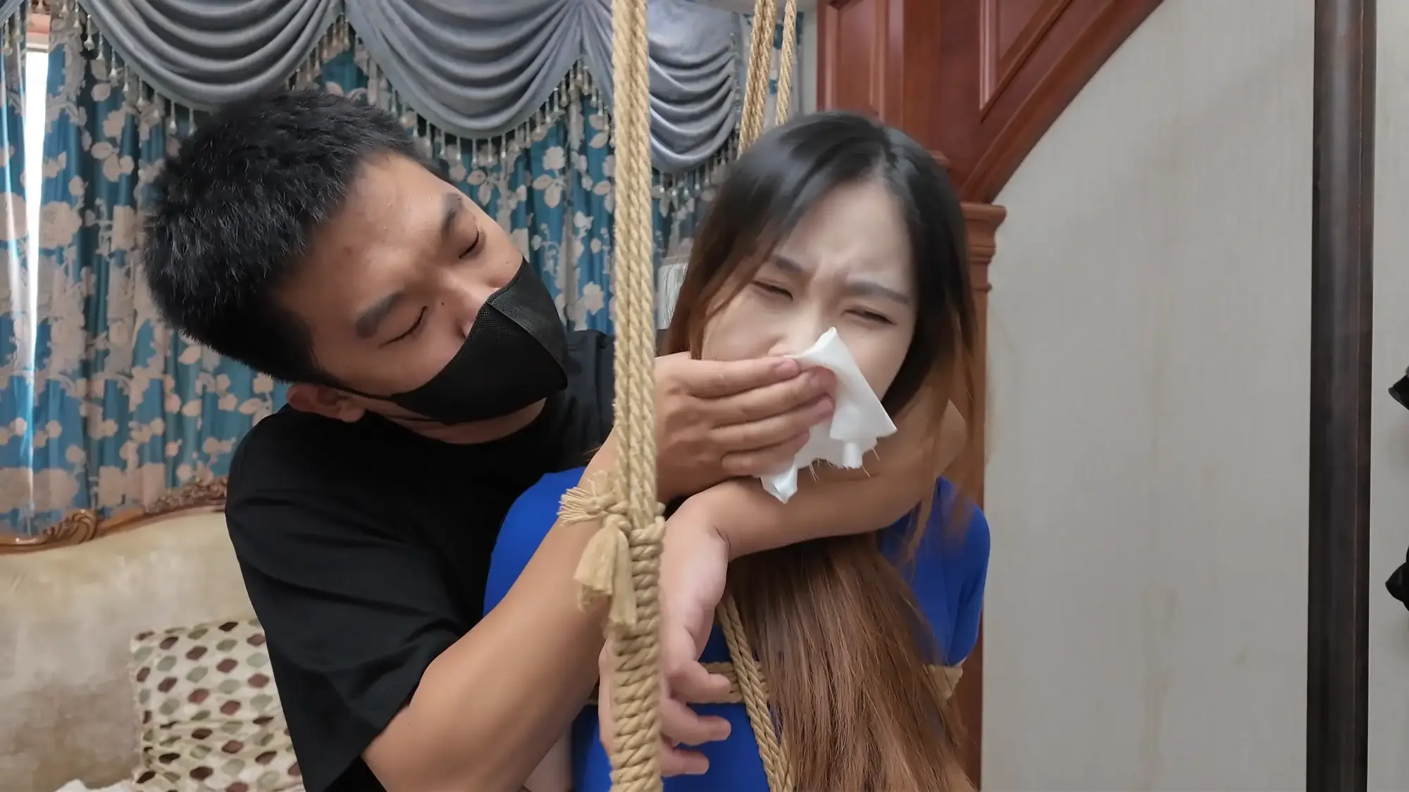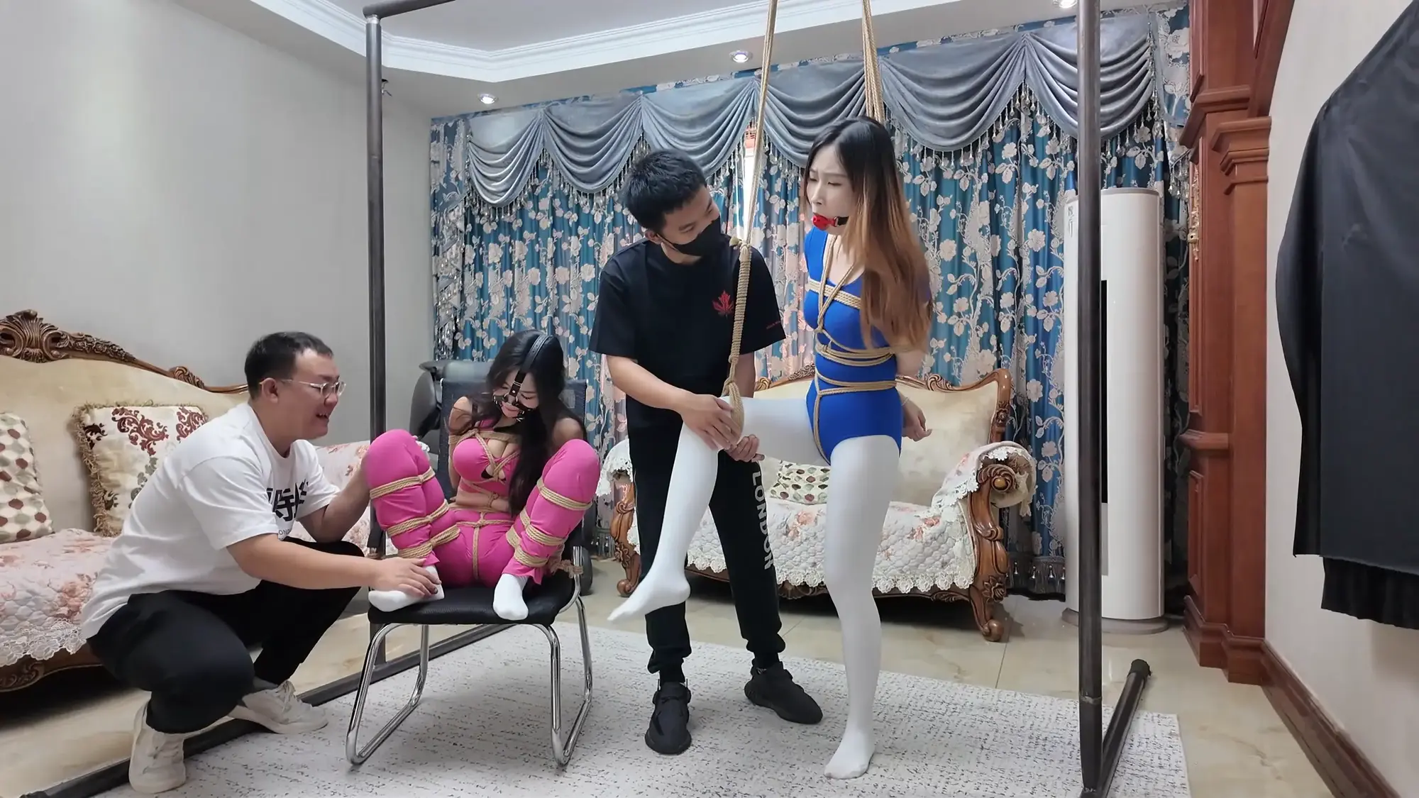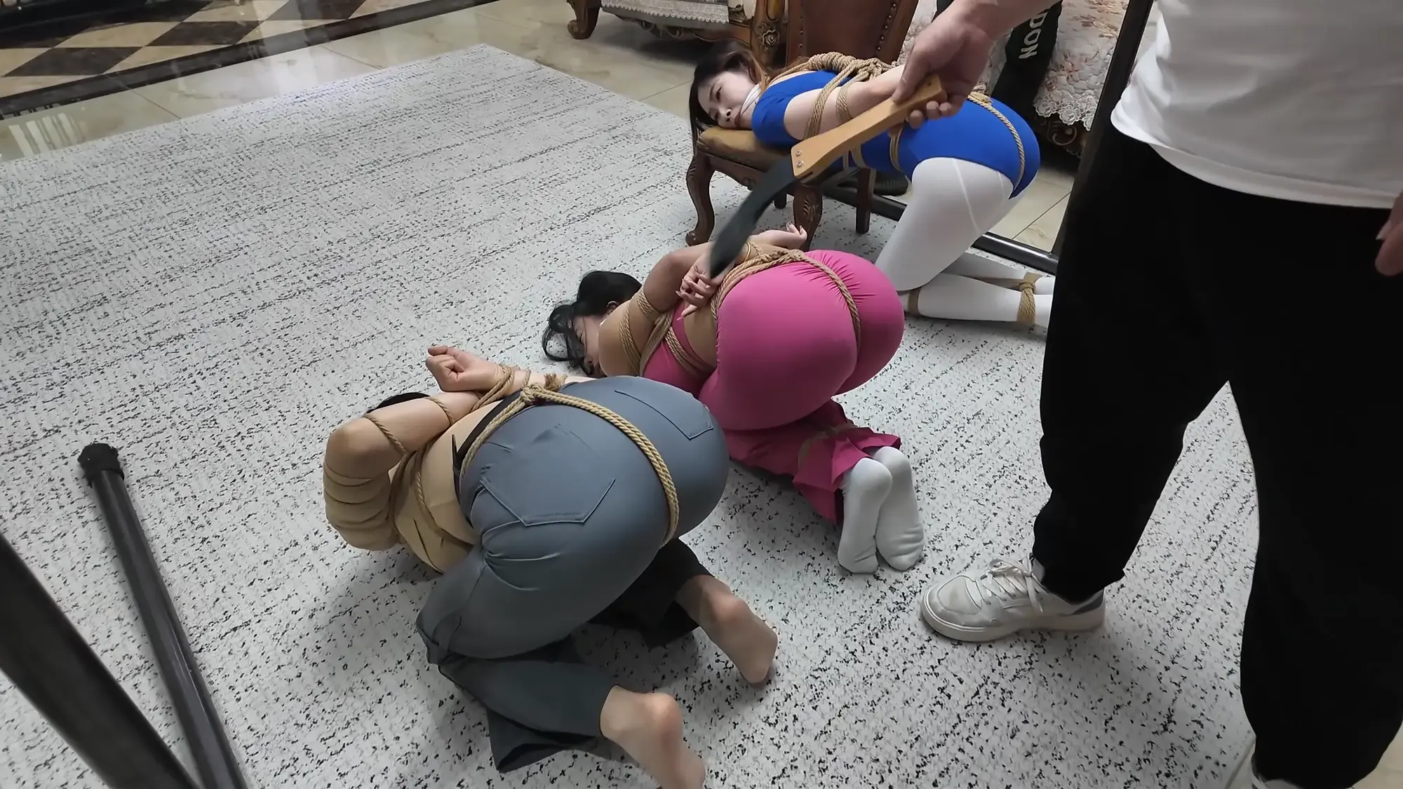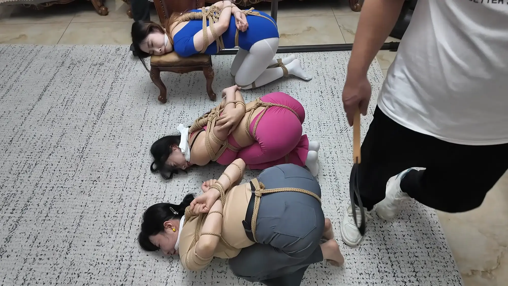 前情提要,南清探员逃跑失败,再次被雷姐的手下抓住,雷姐也被自己的手下背叛。此后,南清与雷姐被囚禁起来,两人分别被换上体操服与瑜伽服遭受折磨。某一日,南清被单腿吊缚,雷姐则是头戴马具,嘴塞口球,m字开腿坐在椅子上,两人照常被两个男人玩弄,小弟表示马上就要把她们卖掉有些舍不得,大哥告诉他自己准备黑吃黑,钱和人自己都要,并说利益最大化是雷姐教给自己的,看到雷姐依旧瞪着自己不肯屈服,大哥开始用力锤击雷姐的腹部,并拉扯雷姐的股绳教训她,一旁的南清也一样不服气,被拿掉口球后依旧放狠话要杀了他们,两个男人大笑嘲讽,小弟拿起鞭子开始教训南清。过了一会儿,大哥的手机发来买家的短信,他命令小弟把南清和雷姐捂晕关到卧室里,一切准备妥当后,大哥让小弟下去接人,自己做好偷袭的准备。
