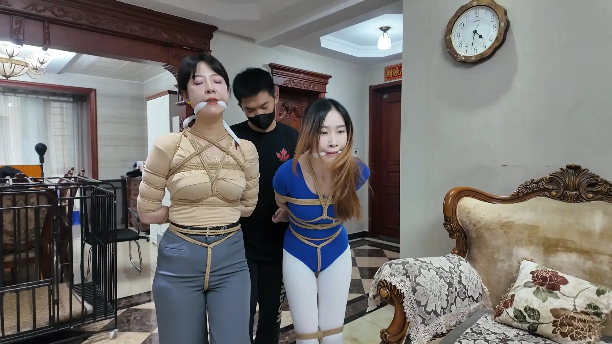 结尾下集预告,雷姐被脱掉外衣,内衣捆绑;e小姐挣脱束缚对峙面具男被石头击落手中的手枪;e小姐南清雷姐再次被捆绑起来,被神秘人拉着绳子带走。