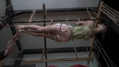 腿和腰也被绳子紧紧缠绕,吊在竹竿上面