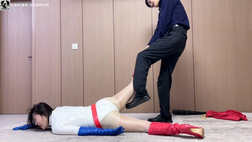 醒来时,她已被换上油亮黑丝、双手被捆、脖子套项圈吊起。敌人闻着换下的肉丝。女超人被狼牙棒连续狠砸,最后腿骨折断,项圈勒住脖子喘不过气,头无力垂下,彻底败北。