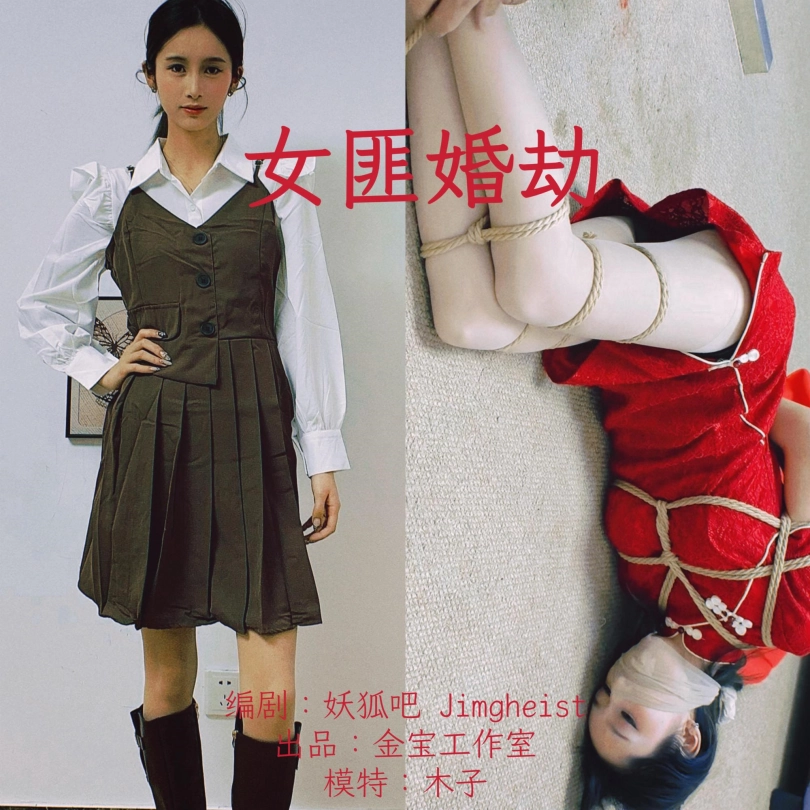 本片的情节来自于一个神奇的志怪故事,不过显然不舍得让漂亮的女匪小姐化为厉鬼,而是尽情展现她在新婚之夜受到的蹂躏。上集主要展现英姿飒爽的女匪小姐落难被擒、绳捆索绑(桌缚、五花大绑椅缚、半吊、丝袜口球堵嘴口水、脱靴挠丝袜脚)的情节,模特服装造型受到怀旧影苑等老片中女匪形象启发,瓜子脸筷子腿的木子梳起马尾辫,配上老板娘【Q:3766687640】精心购置的马甲衬衫、短裙骑士靴、超薄肉丝,显得英气十足,被缚后的手脚宛如捆在一起的花枝,细弱柔软却充满韧性,柔弱无助却极力反抗——看似扁平的躯干则在紧缚之下凹凸有致。至于剧照中的红色旗袍婚服,似乎预示着下集中她凄美的结局……
