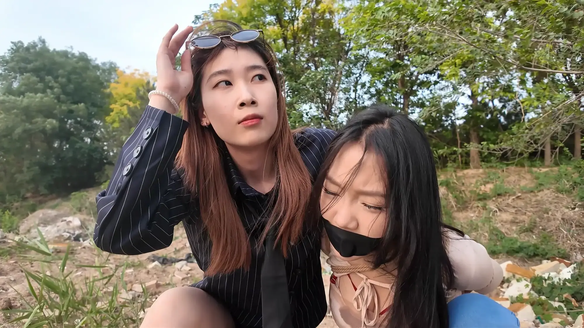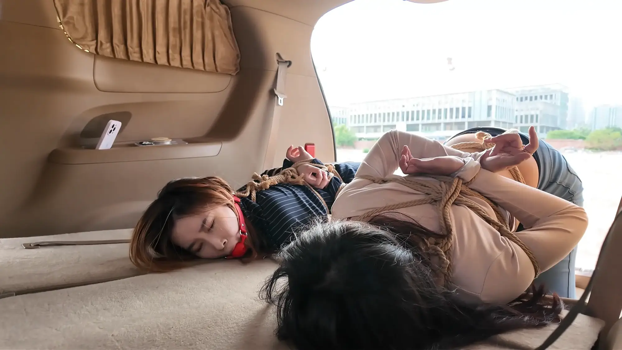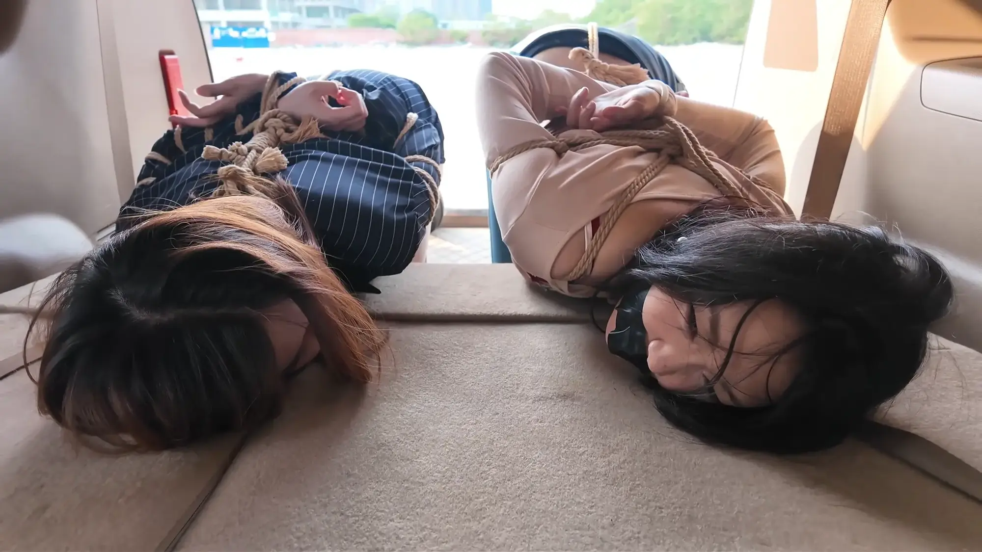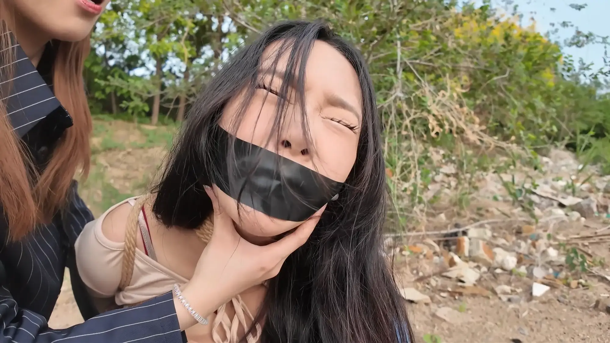 剧情南清抓住机会脱缚,成功制服了没有小弟保护的雷姐(佳雯),南清将雷姐绑起来作为人质,但雷姐的手下开车很快追了上来,躲在角落里的南清按住雷姐,警告她不要乱叫,正在南清四周环顾考虑如何逃跑的间隙,雷姐借机撞倒南清,站起身呼救,听到声音的小弟终于发现了南清,南清本想逃走但小弟威胁她敢乱动就开枪,走投无路的南清举起双手投降,再次被小弟五花大绑起来。小弟将南清绑好后将她压了过来,一旁的雷姐不停挣扎,小弟笑嘻嘻的撕掉她嘴上的胶布,雷姐非常生气,训斥小弟为什么不早点给她松绑,忍无可忍的小弟掐住了雷姐的脖子,告诉她自己不干了,南清警告他们叛徒没有好下场,小弟们听后哈哈大笑,并用力锤击雷姐的腹部泄愤,接着用胶布将雷姐的嘴再次堵上,两人压着南清和雷姐,带到了车里。将两人以羞耻的姿势放置在后备箱,小弟给南清换上了口球,任由两人在车内挣扎。过了一会儿,小弟们商量在车内办掉两人,完事后再将两人卖掉拿钱去潇洒,听到这话的南清和雷姐只能绝望的互相看着对方。雷姐被带到后座,身体被小弟乱摸,股绳也被不停拉扯,雷姐不服气的瞪着小弟,但也无能为力,只能被不停折磨,而一旁的南清则是先被脱掉鞋子,露出黑丝双脚被挠痒,雷姐也被脱掉鞋子,露出白色的袜子,被小弟按住腿不停挠痒。办完事后,两位美女气喘吁吁的躺在后备箱,小弟关上车门,开车带着两人离开。
