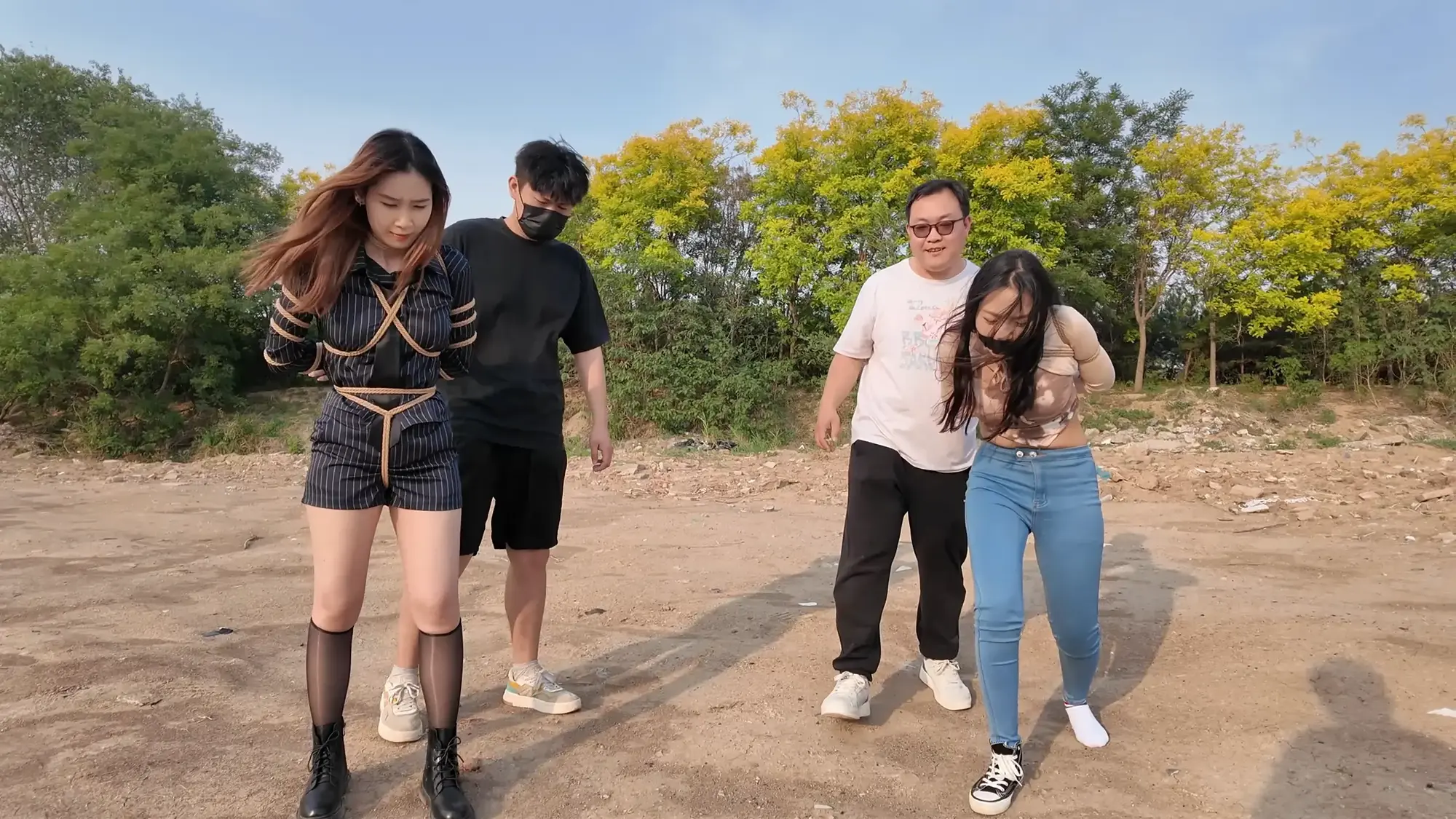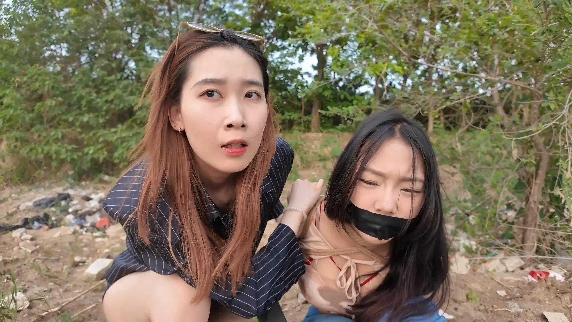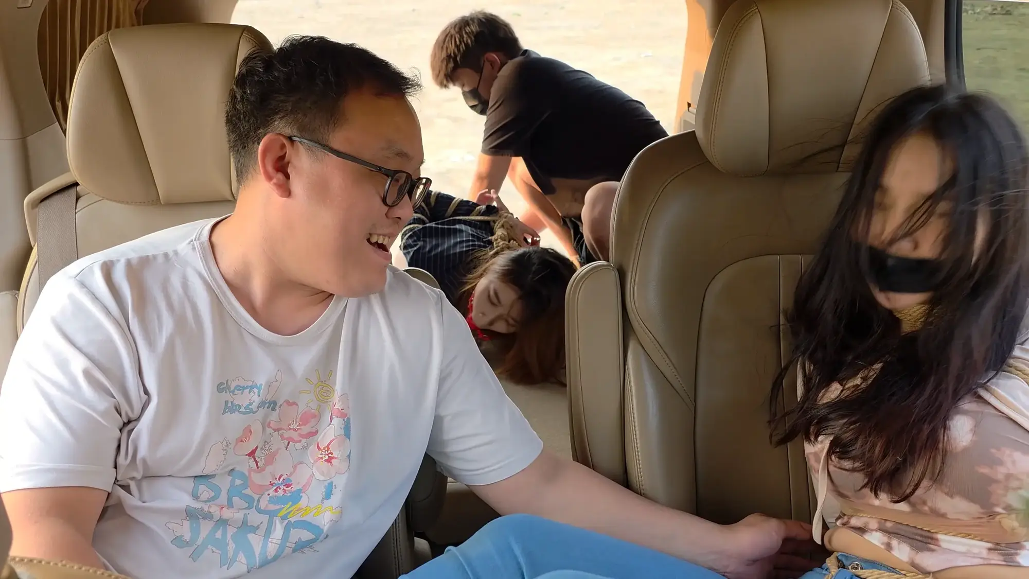 剧情南清抓住机会脱缚,成功制服了没有小弟保护的雷姐(佳雯),南清将雷姐绑起来作为人质,但雷姐的手下开车很快追了上来,躲在角落里的南清按住雷姐,警告她不要乱叫,正在南清四周环顾考虑如何逃跑的间隙,雷姐借机撞倒南清,站起身呼救,听到声音的小弟终于发现了南清,南清本想逃走但小弟威胁她敢乱动就开枪,走投无路的南清举起双手投降,再次被小弟五花大绑起来。小弟将南清绑好后将她压了过来,一旁的雷姐不停挣扎,小弟笑嘻嘻的撕掉她嘴上的胶布,雷姐非常生气,训斥小弟为什么不早点给她松绑,忍无可忍的小弟掐住了雷姐的脖子,告诉她自己不干了,南清警告他们叛徒没有好下场,小弟们听后哈哈大笑,并用力锤击雷姐的腹部泄愤,接着用胶布将雷姐的嘴再次堵上,两人压着南清和雷姐,带到了车里。将两人以羞耻的姿势放置在后备箱,小弟给南清换上了口球,任由两人在车内挣扎。过了一会儿,小弟们商量在车内办掉两人,完事后再将两人卖掉拿钱去潇洒,听到这话的南清和雷姐只能绝望的互相看着对方。雷姐被带到后座,身体被小弟乱摸,股绳也被不停拉扯,雷姐不服气的瞪着小弟,但也无能为力,只能被不停折磨,而一旁的南清则是先被脱掉鞋子,露出黑丝双脚被挠痒,雷姐也被脱掉鞋子,露出白色的袜子,被小弟按住腿不停挠痒。办完事后,两位美女气喘吁吁的躺在后备箱,小弟关上车门,开车带着两人离开。