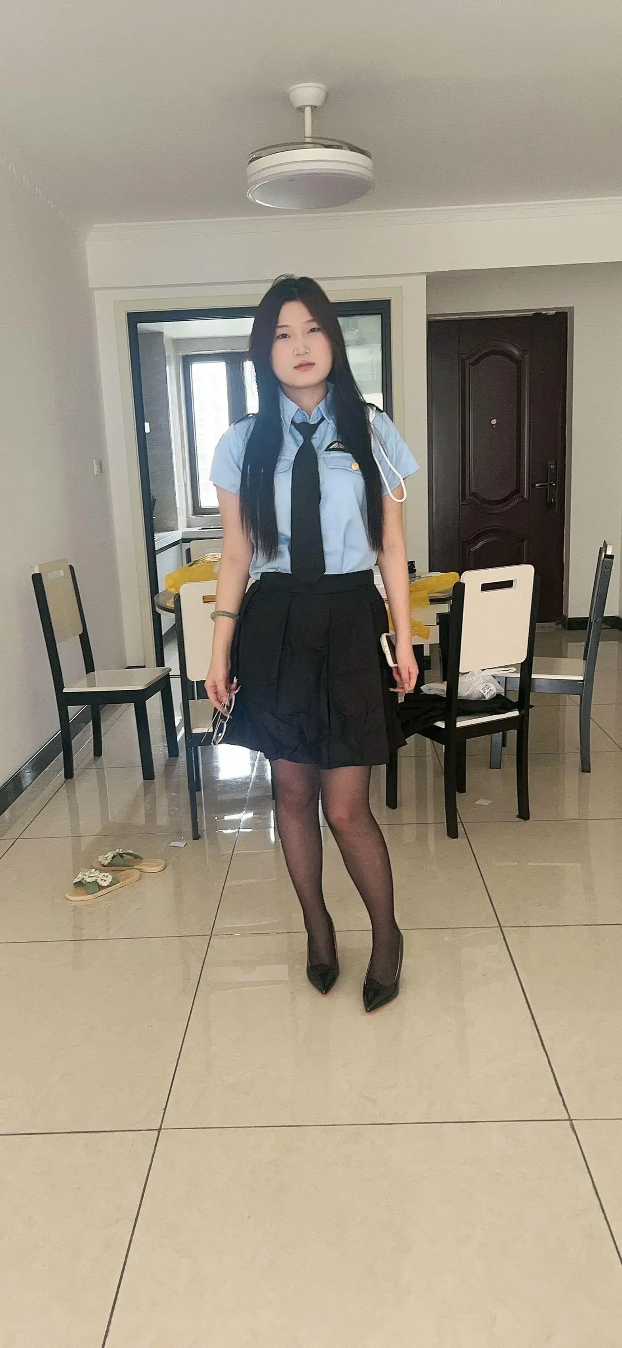 服装:女警制服(天蓝色警服衬衣+黑色短裙+肉色丝袜+黑色红底高跟鞋)