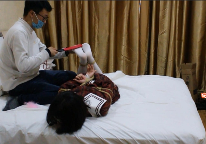 妹子还是第一次体验捆绑,害羞的很呢。不过绑成驷马就只能乖乖的趴在床上啦√