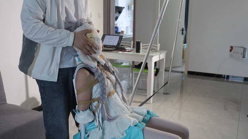 “很痛苦……但也觉得有点快乐……”摄影师再一次捂晕了妹子,把她塞入旅行箱中带走。在摄影师家中,换上了黑丝和女仆装的妹子被十字拘束,同时忍受着摄影师的各种玩弄。在快感中失去了意识之后,妹子被丝袜全包当做抱枕被放在摄影师的床上,就这样,摄影师的新女仆引来了在主人家中第一个夜晚。